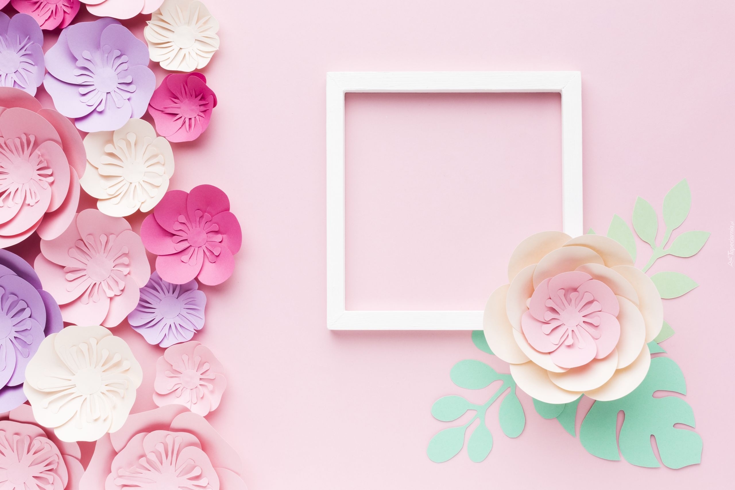Edytor tapety: Papierowe kwiaty obok ramki na różowym tle