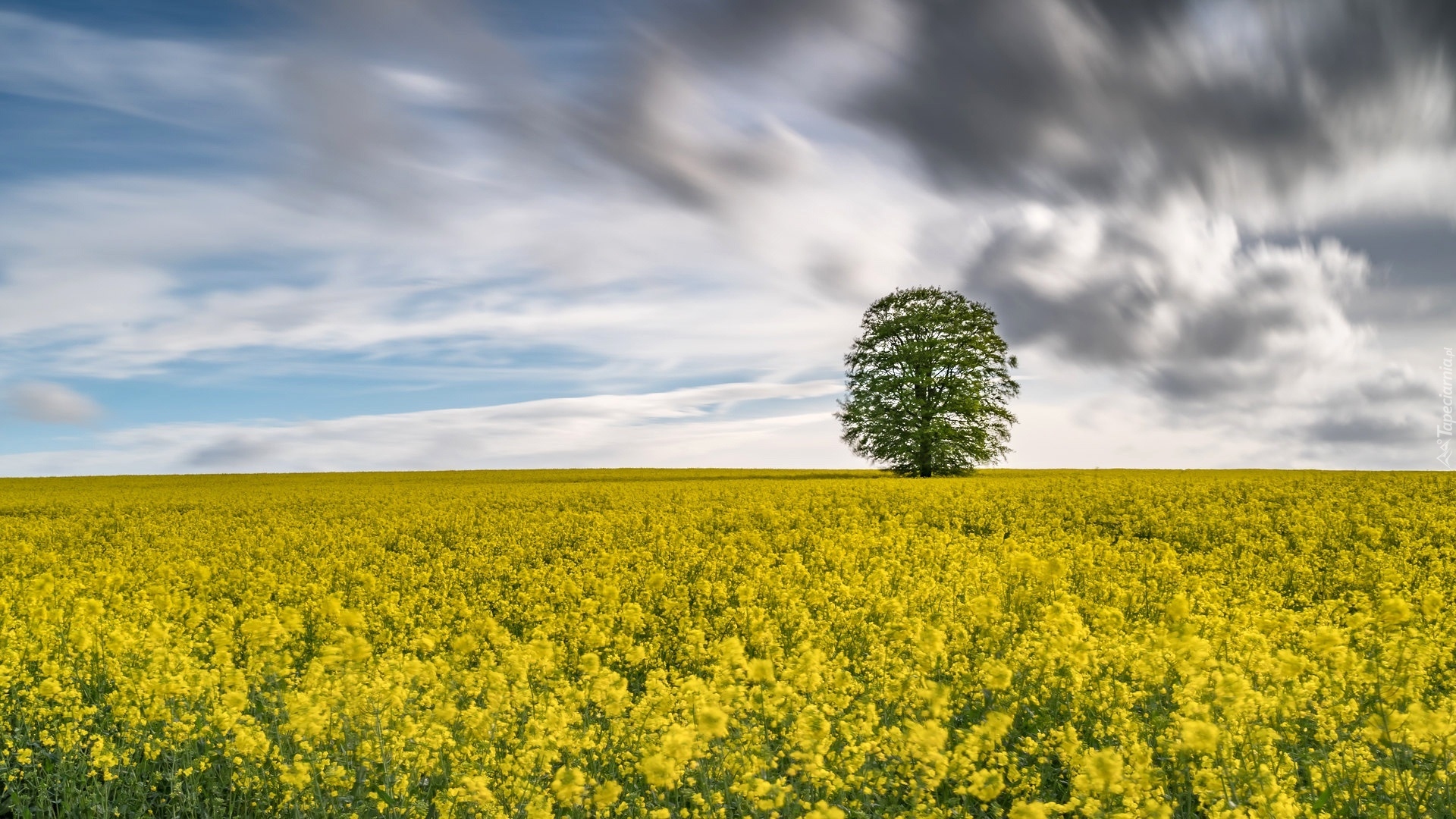 Edytor tapety: Samotne drzewo na polu rzepaku