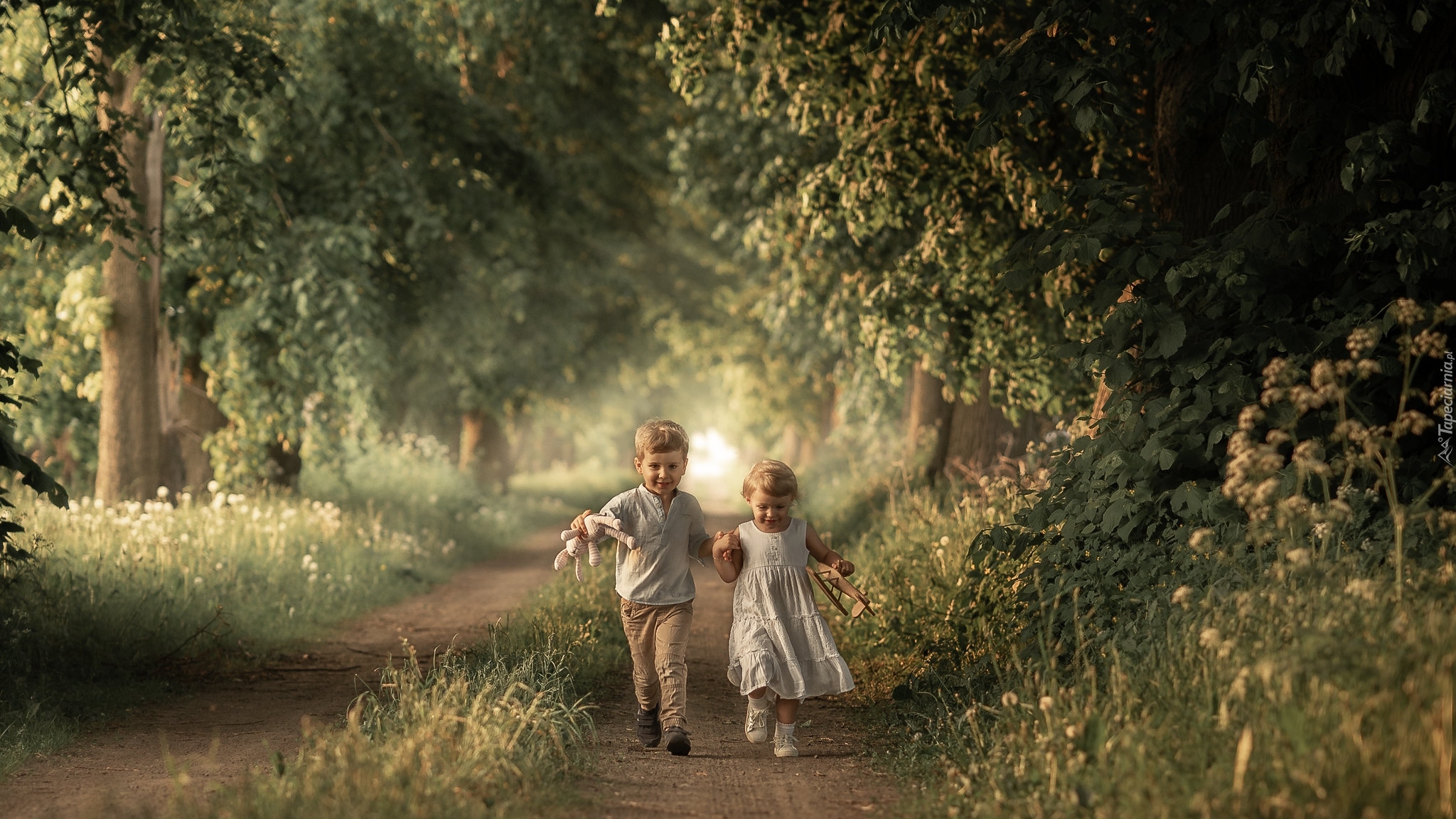 Edytor tapety: Chłopiec z dziewczynką na leśnej drodze