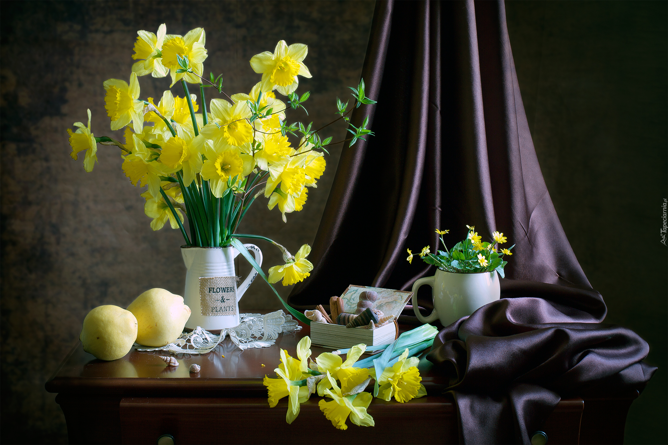 Edytor tapety: Żółte żonkile i pudełko z muszelkami w kompozycji
