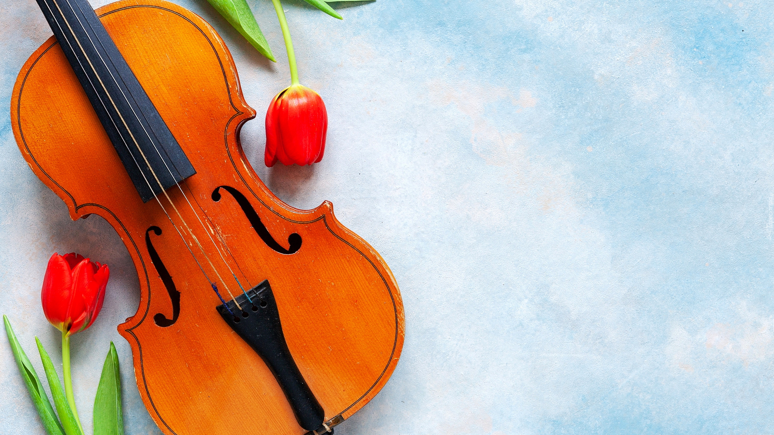 Edytor tapety: Dwa czerwone tulipany obok skrzypiec
