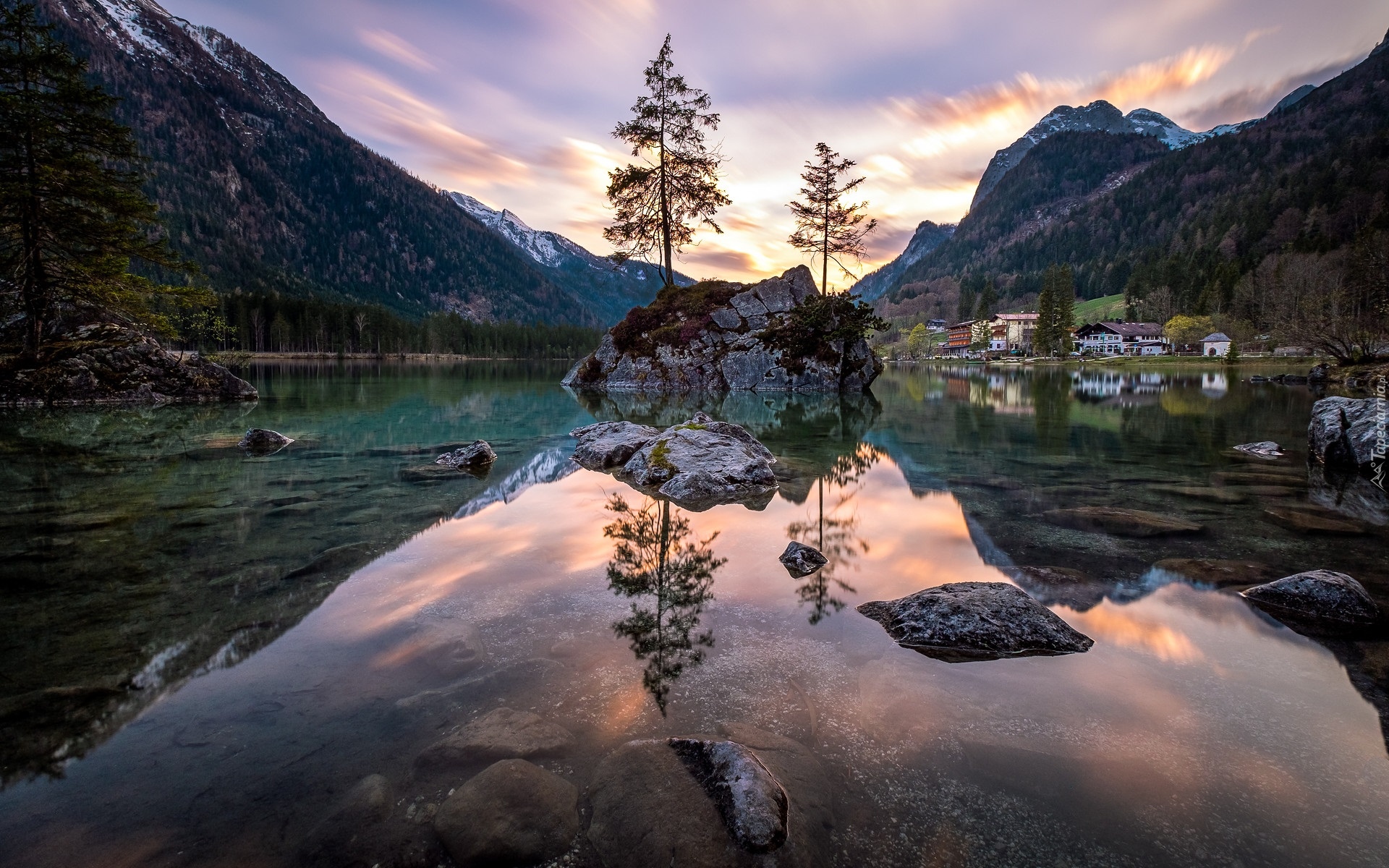 Edytor tapety: Skalna wysepka z drzewami na jeziorze Hintersee