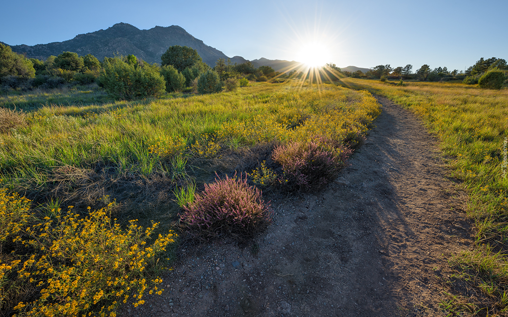 Edytor tapety: Droga przez łąkę w promieniach słońca