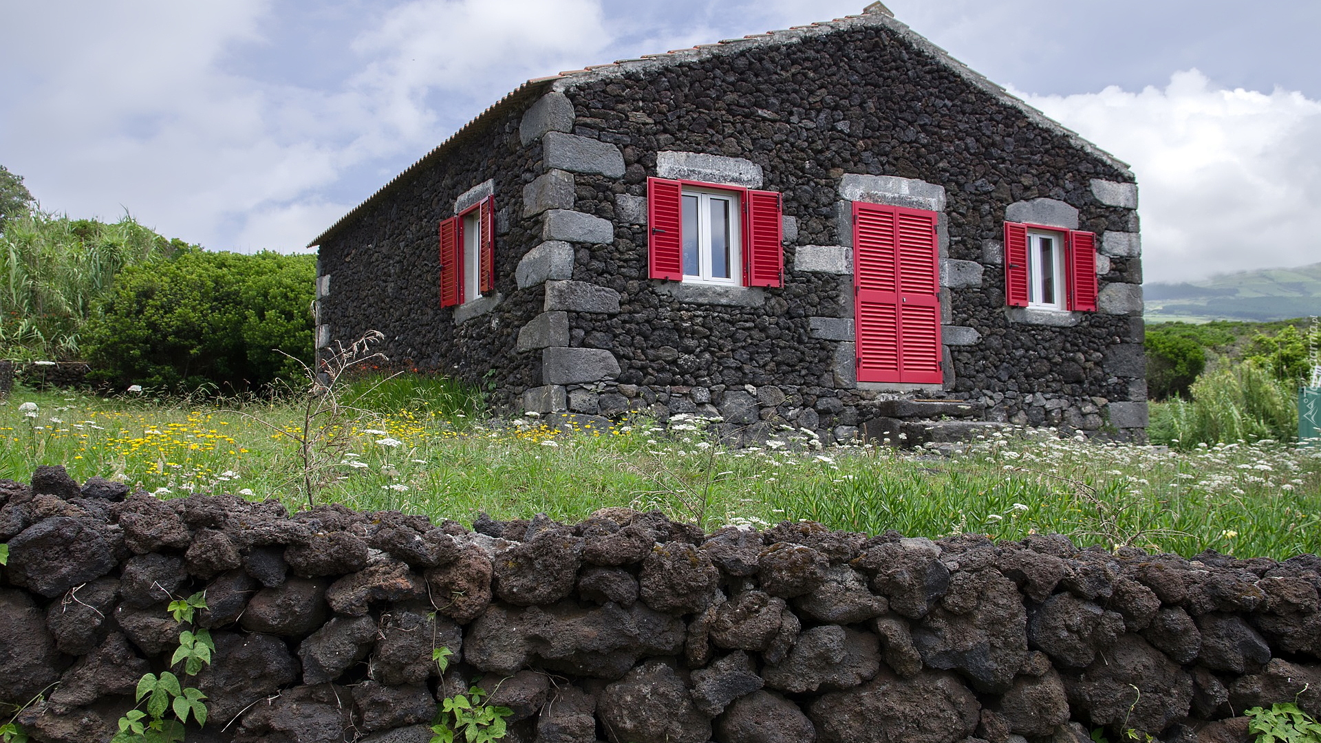 Edytor tapety: Kamienny dom z czerwonymi okiennicami
