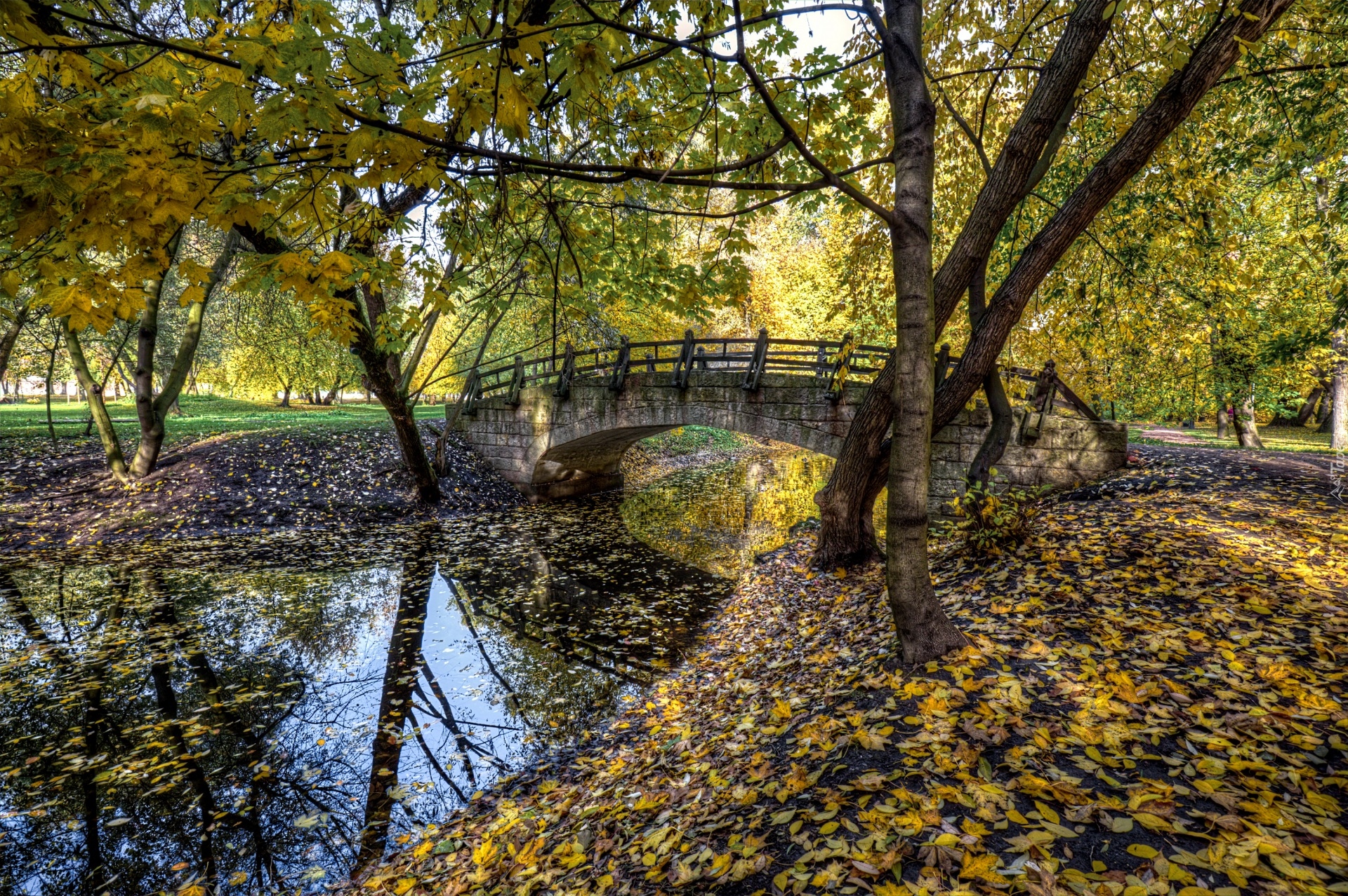 Edytor tapety: Mostek i drzewa nad rzeczką w jesiennym parku