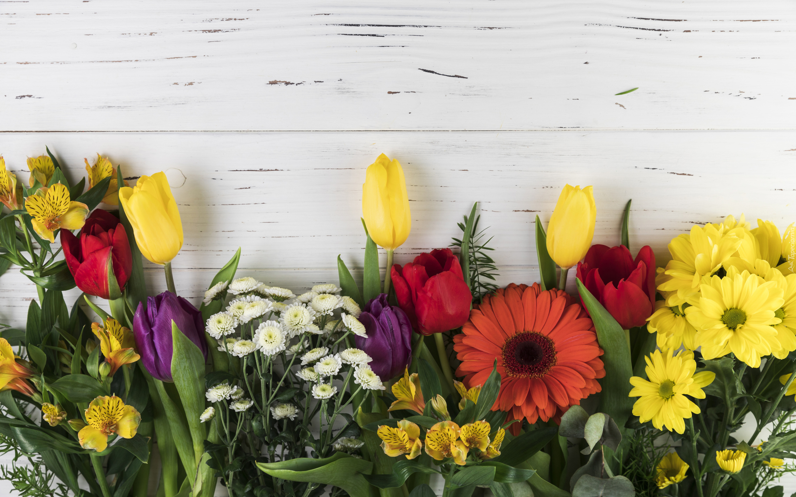 Edytor tapety: Różne kolorowe kwiaty na deskach