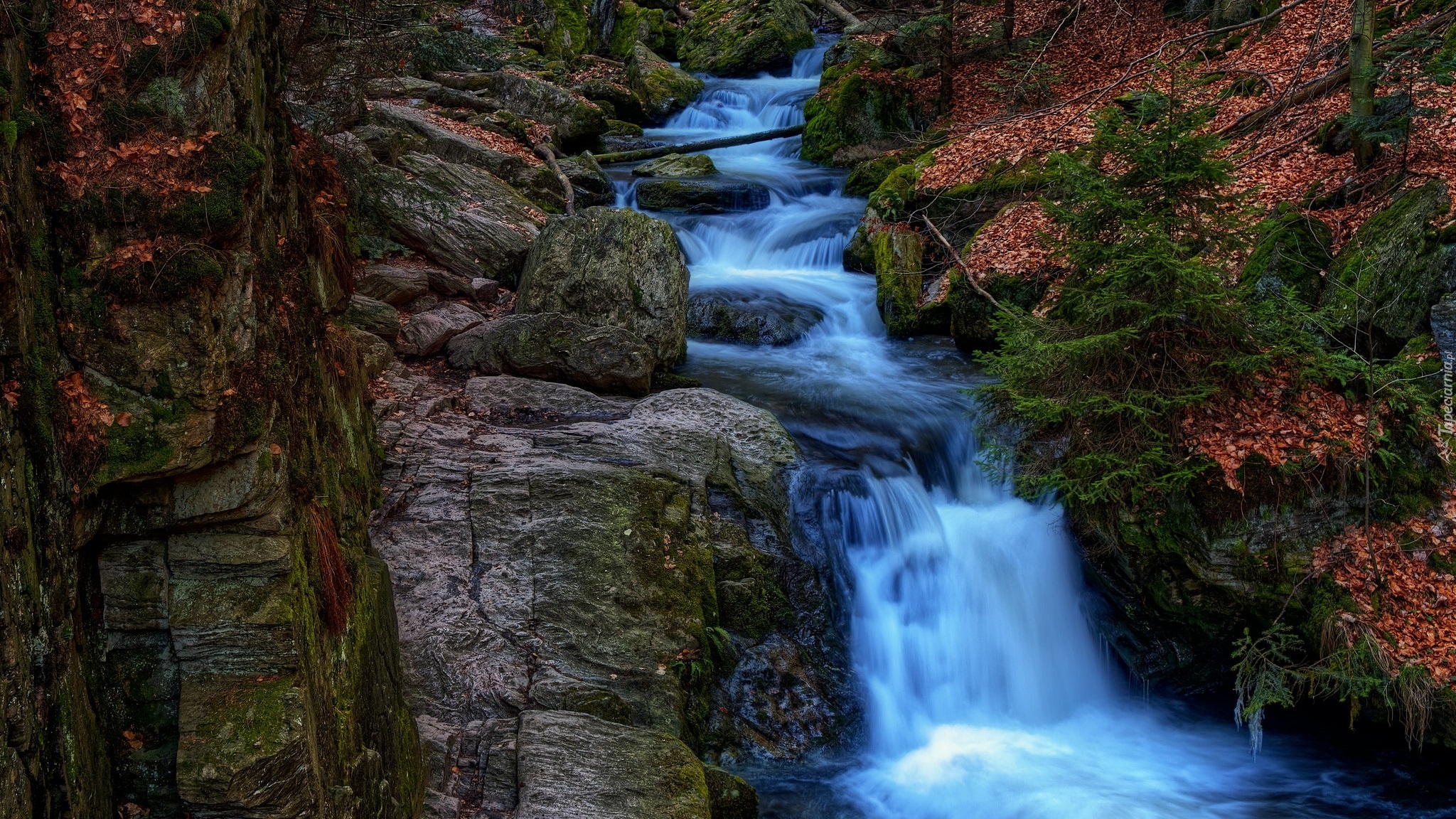 Edytor tapety: Opadłe liście na skałach przy wodospadzie
