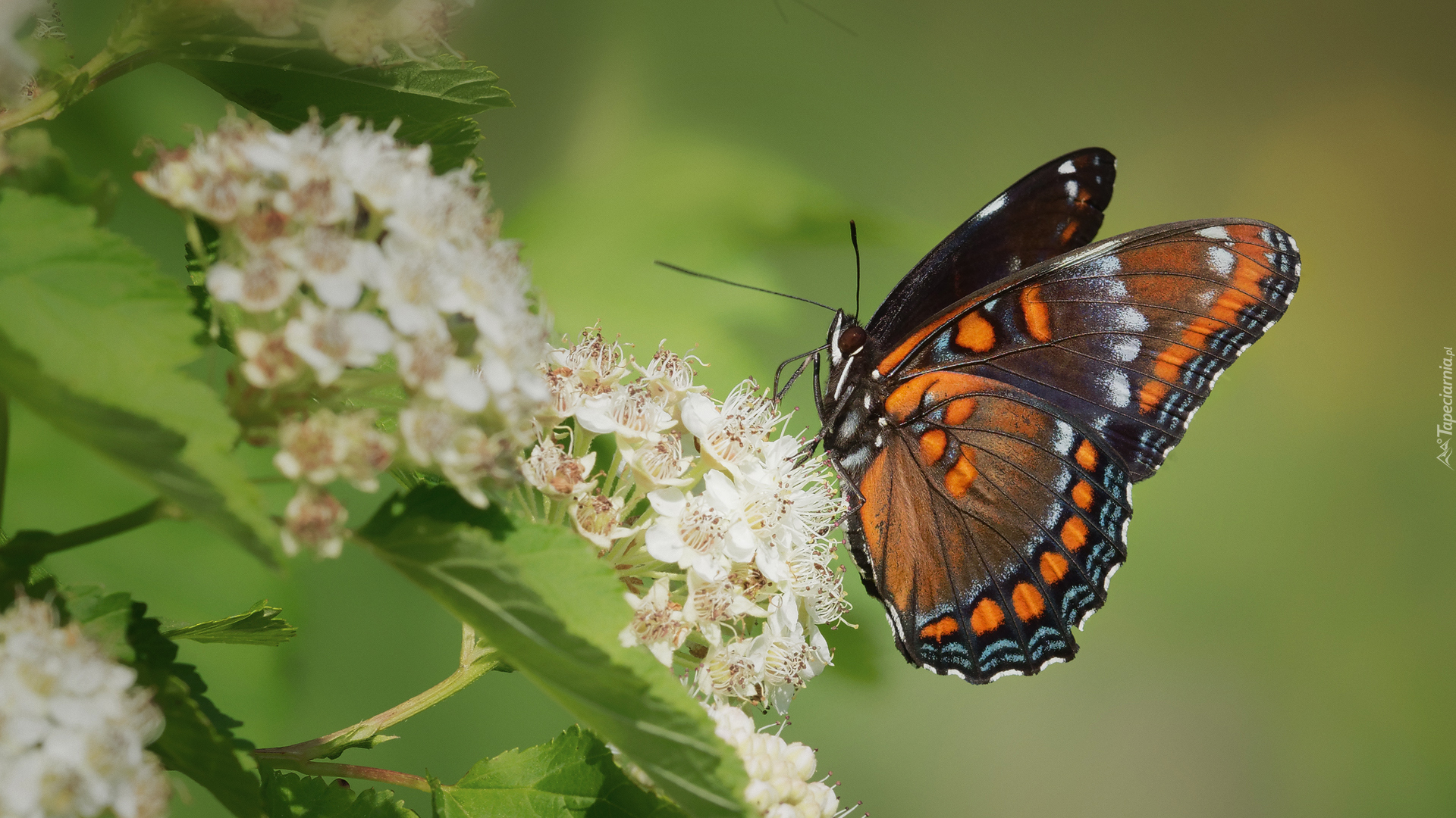 Edytor tapety: Admirał purpurowy na białych kwiatach