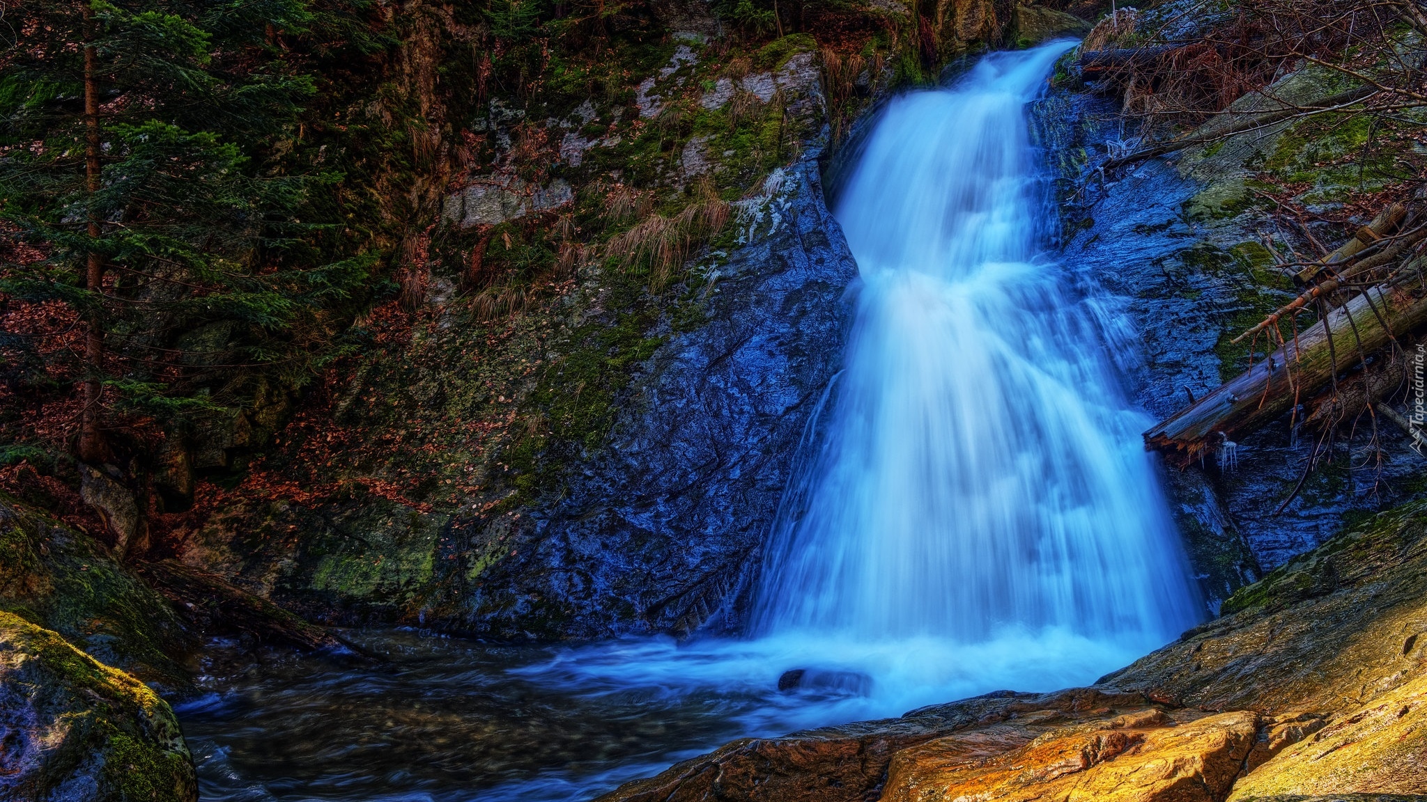 Edytor tapety: Wpadający do rzeki wodospad na skale