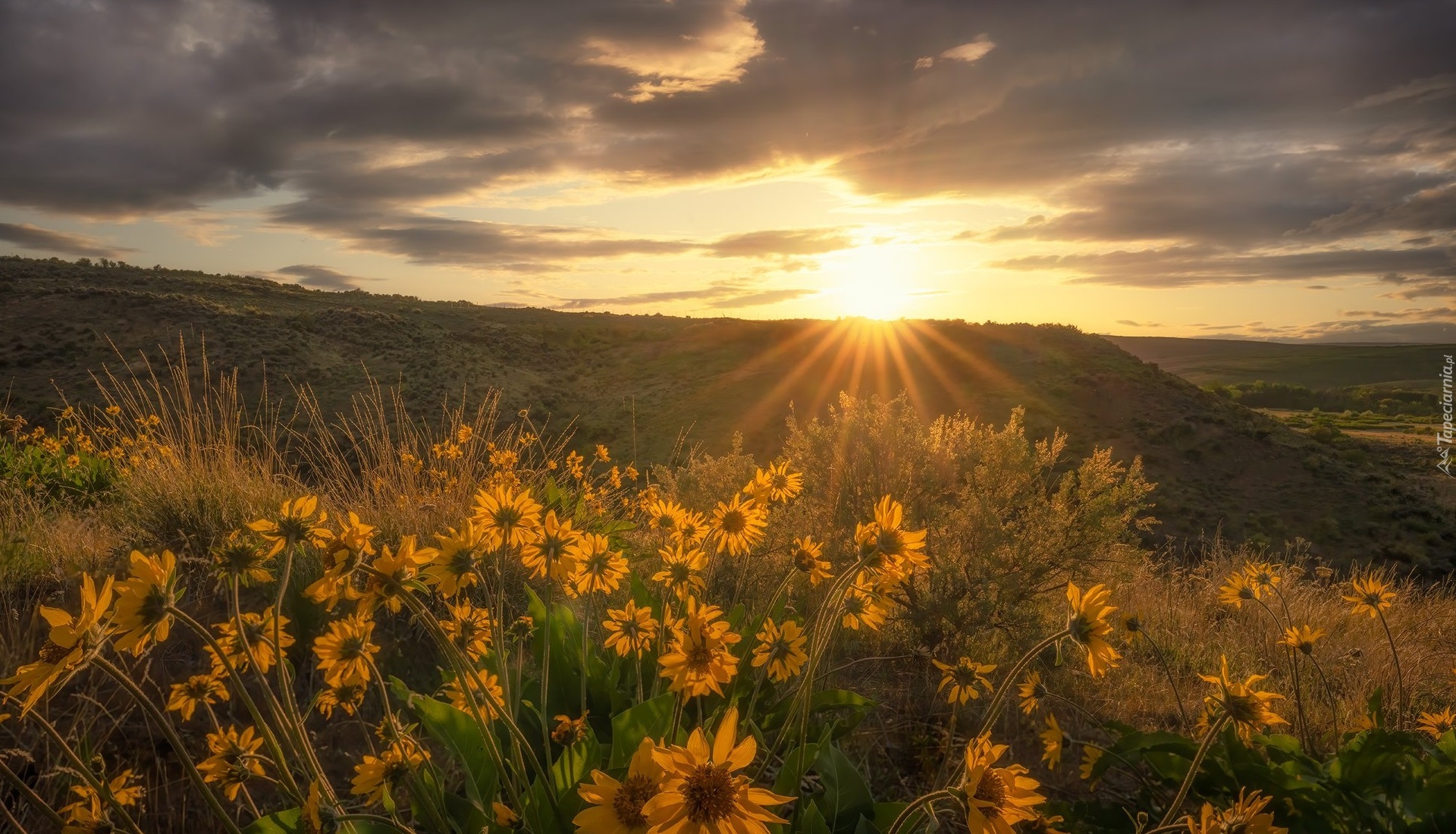 Edytor tapety: Łąka z balsamorhizą w promieniach słońca