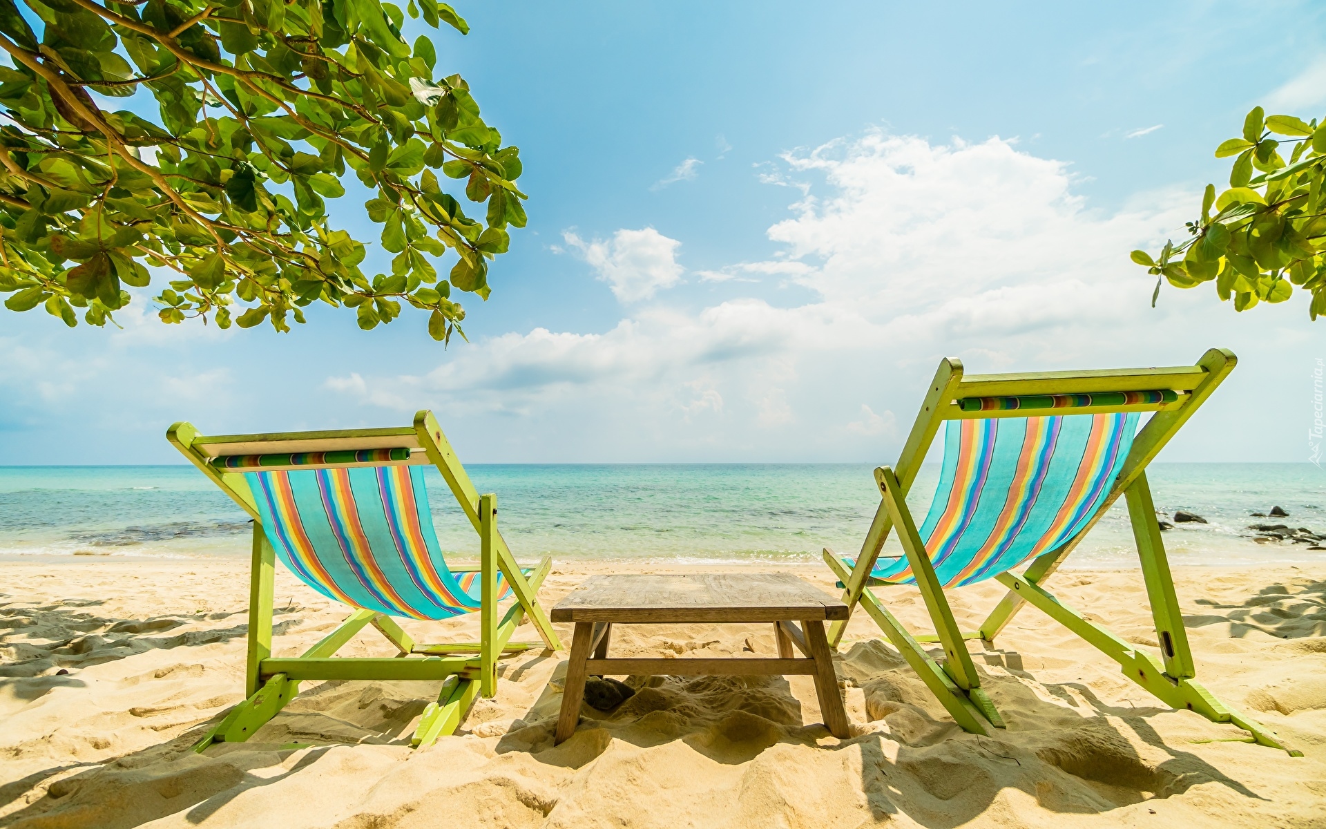 Edytor tapety: Dwa leżaki obok stolika na plaży