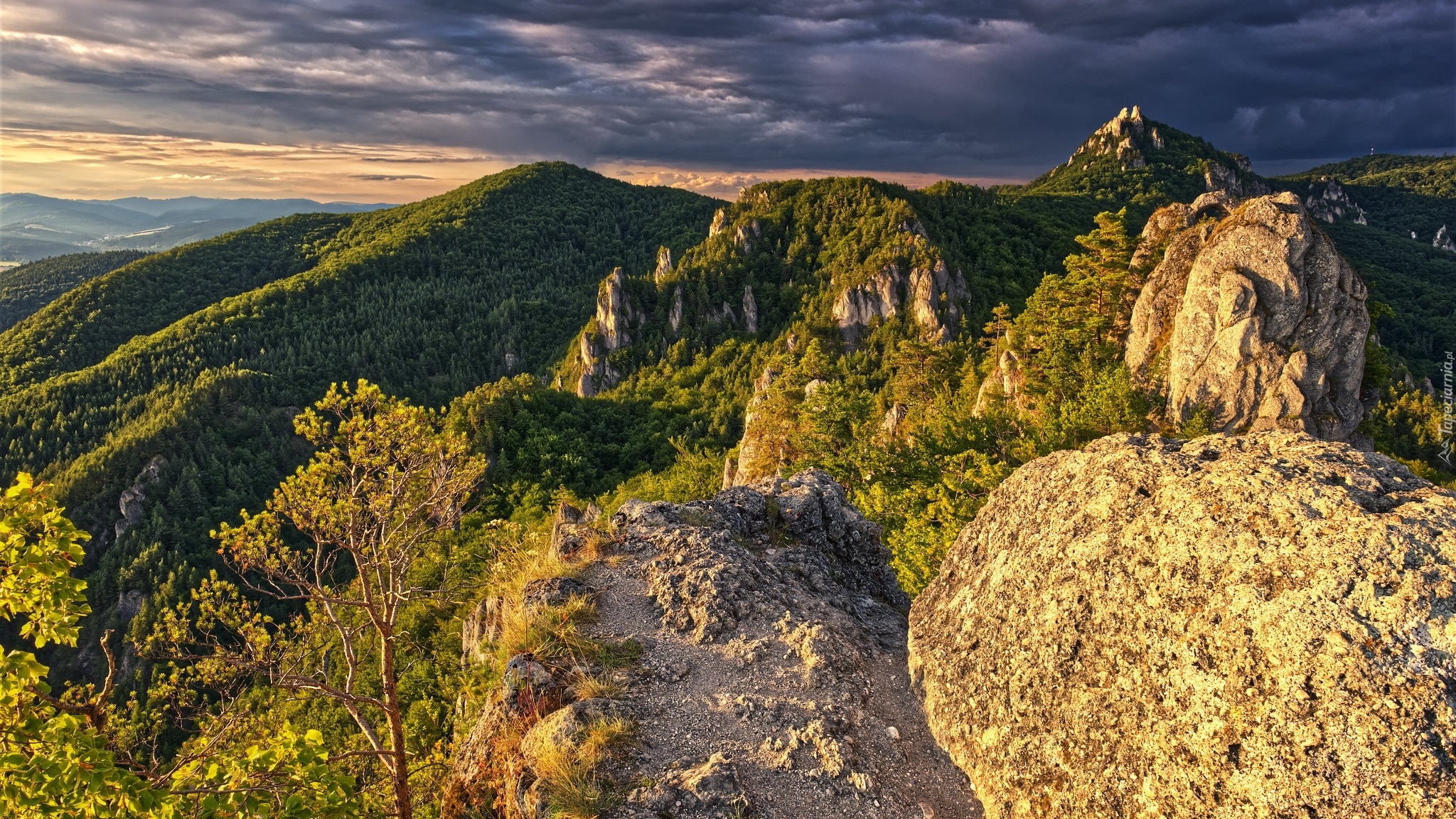 Edytor tapety: Skały w słońcu na tle zalesionych gór