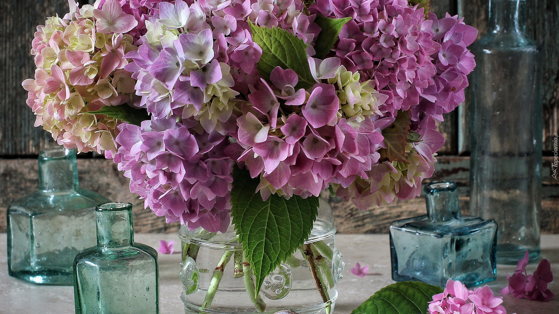 Edytor tapety: Bukiet hortensji w wazonie obok szklanych buteleczek