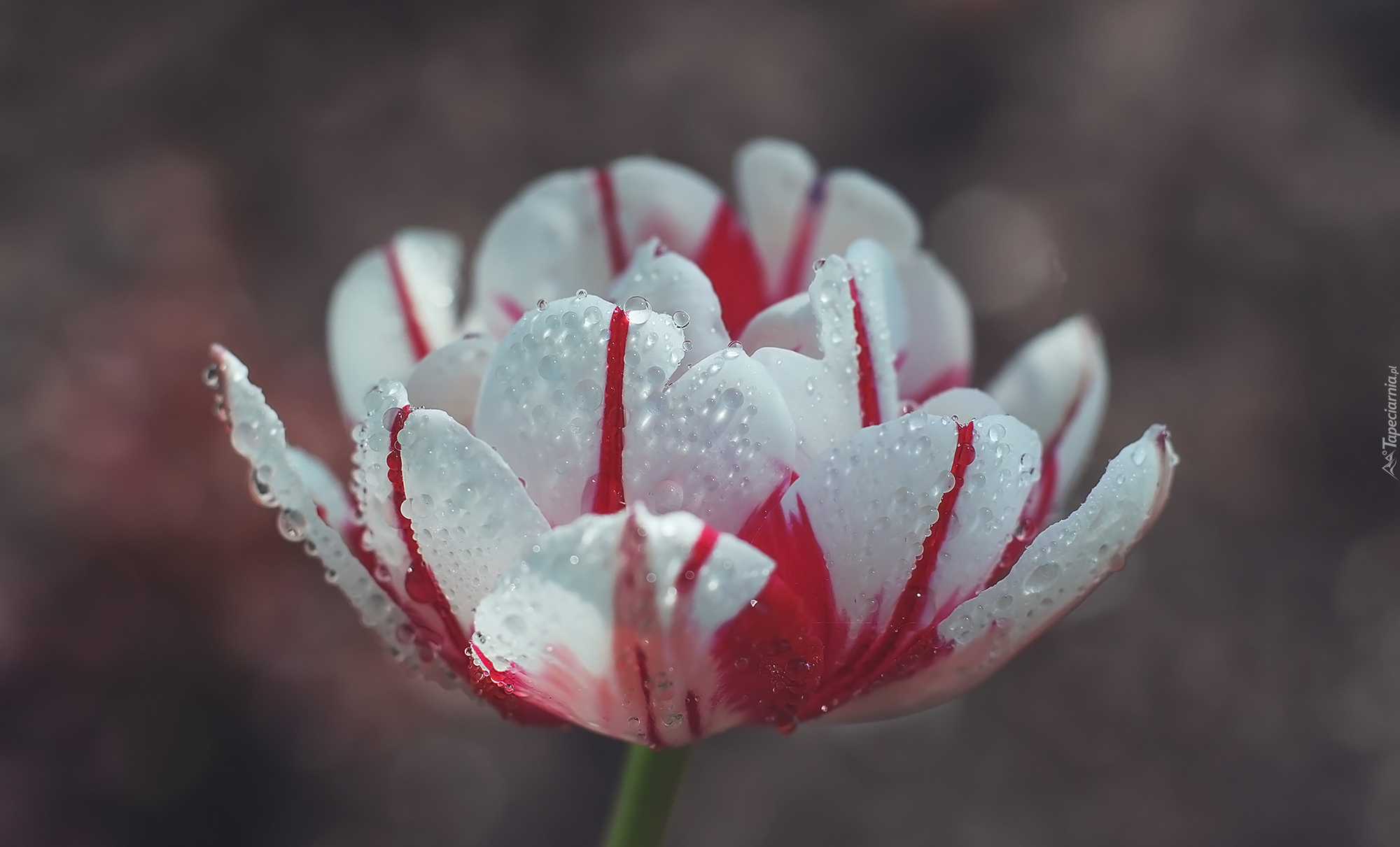 Edytor tapety: Biało-czerwony tulipan z kropelkami rosy
