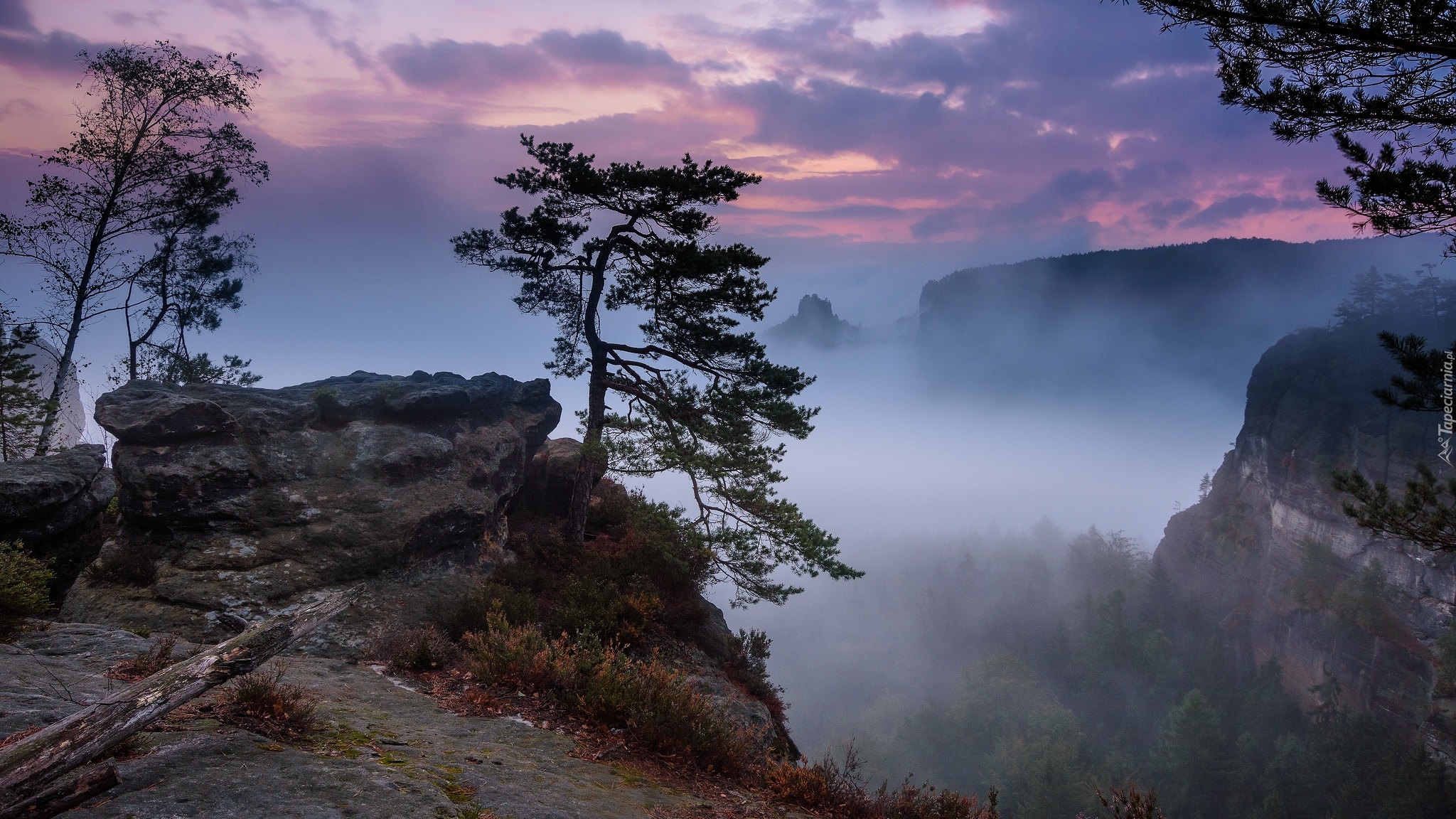 Edytor tapety: Sosny na skałach nad zamgloną doliną