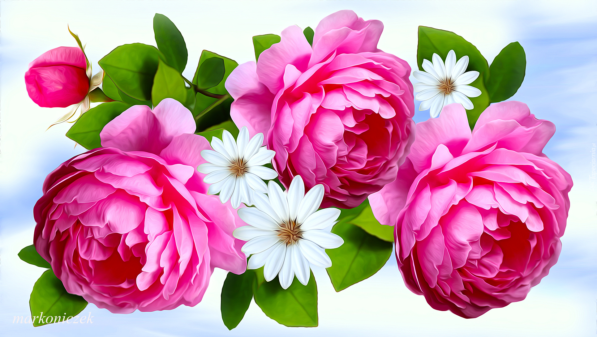 Edytor tapety: Trzy róże i białe kwiaty w grafice