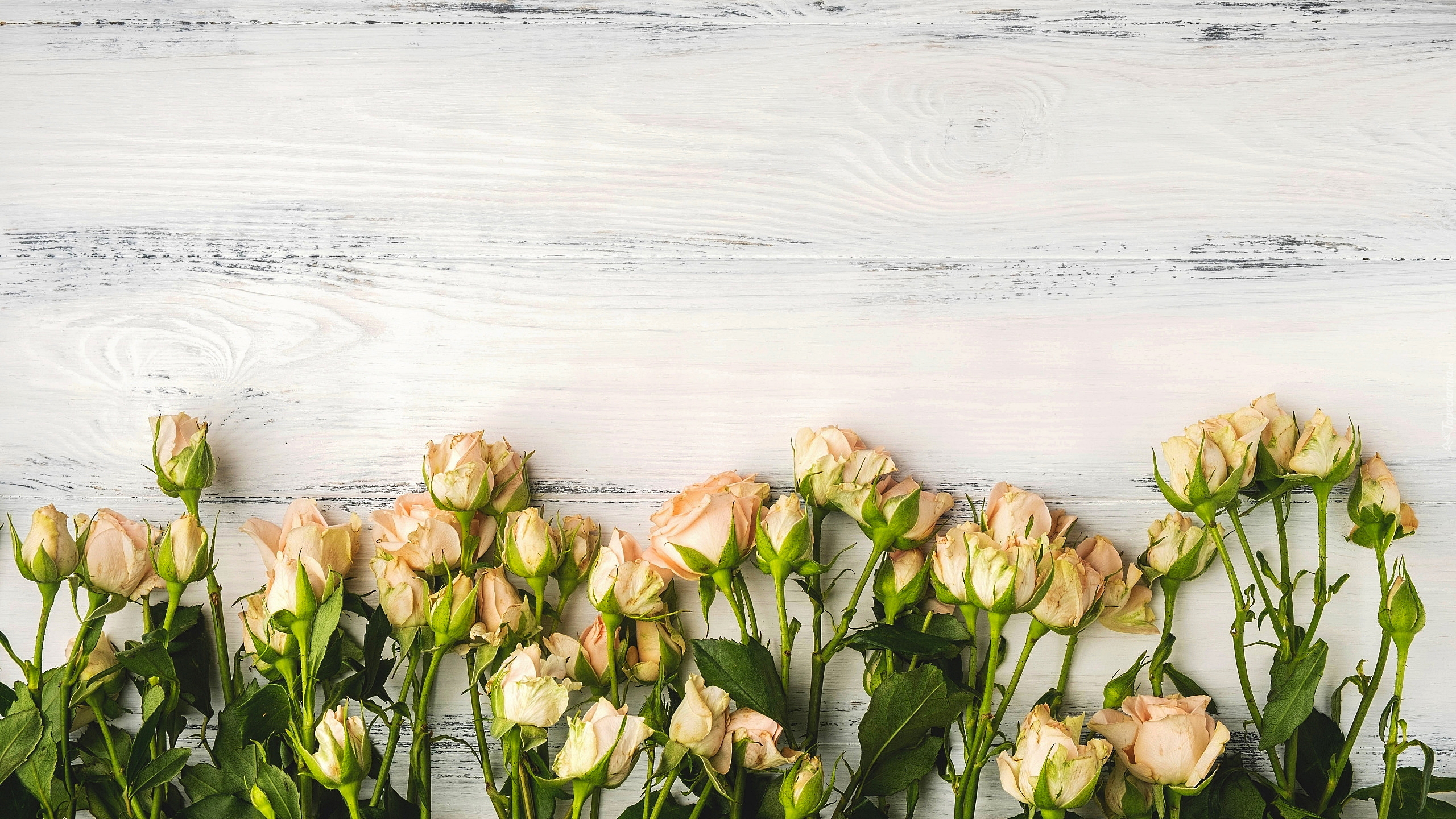 Edytor tapety: Kremowe róże ułożone na jasnych deskach