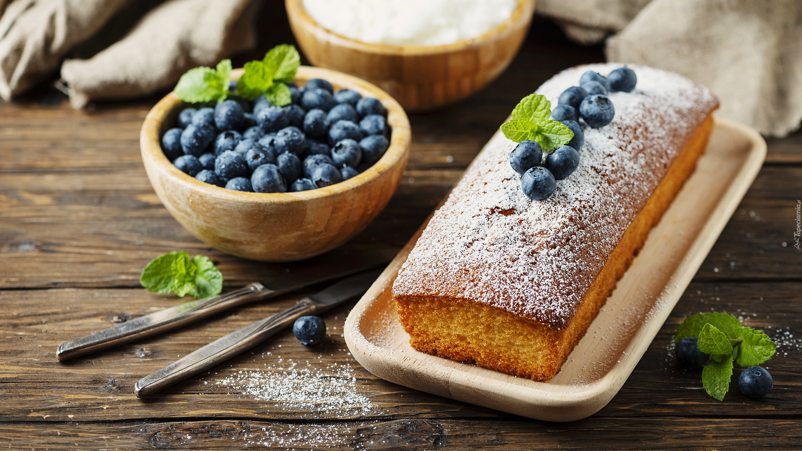 Edytor tapety: Ciasto posypane cukrem pudrem i ozdobione jagodami