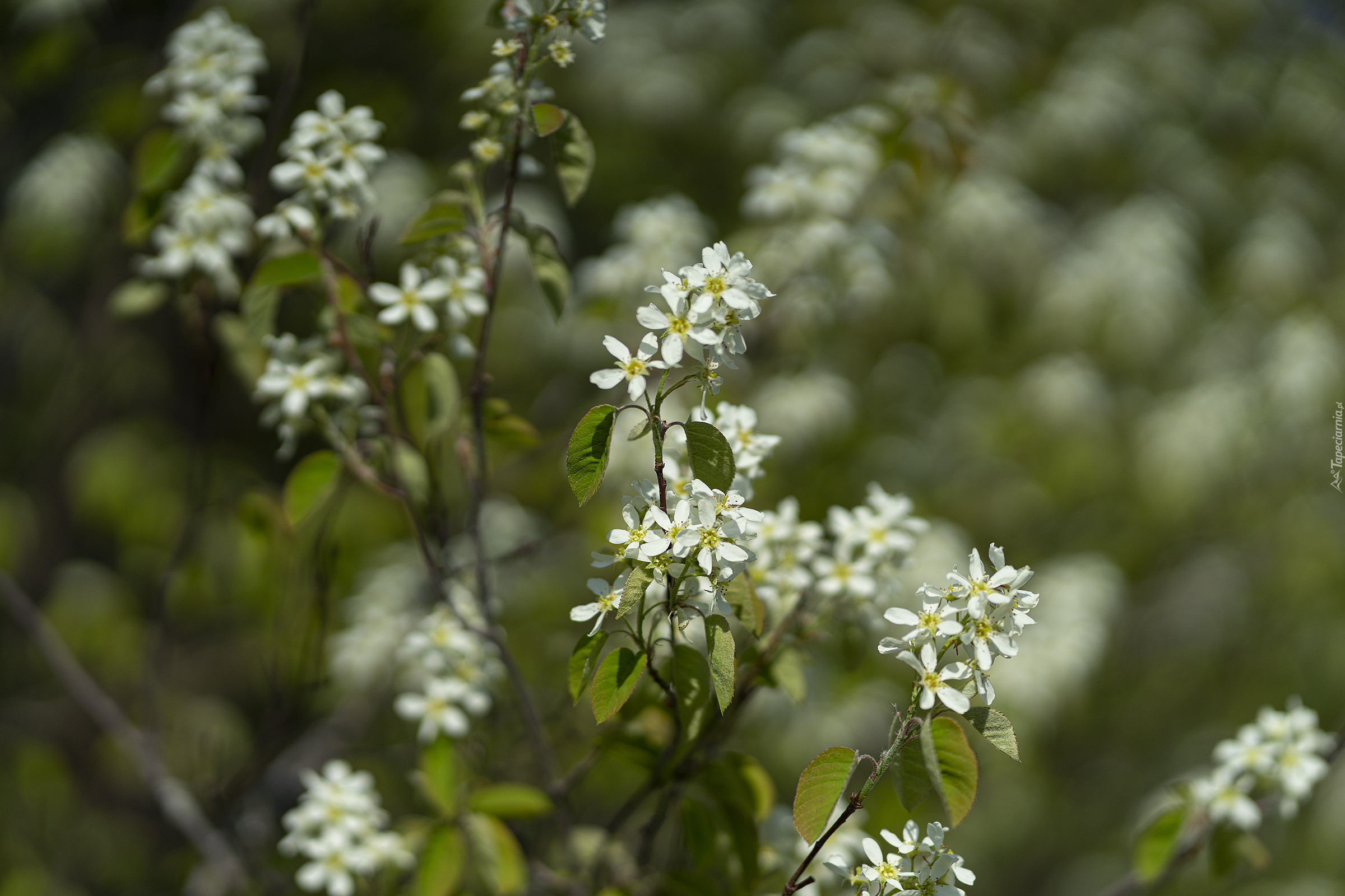 Edytor tapety: Gałązki z białymi kwiatkami w zbliżeniu