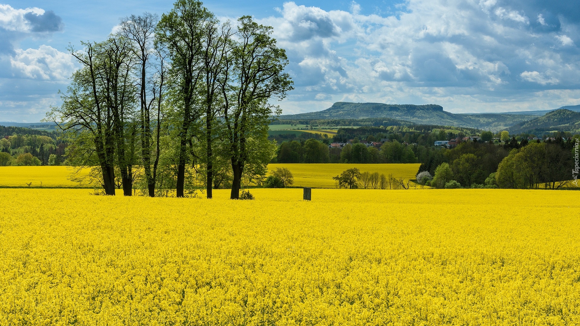 Edytor tapety: Drzewa na złocistym polu rzepaku