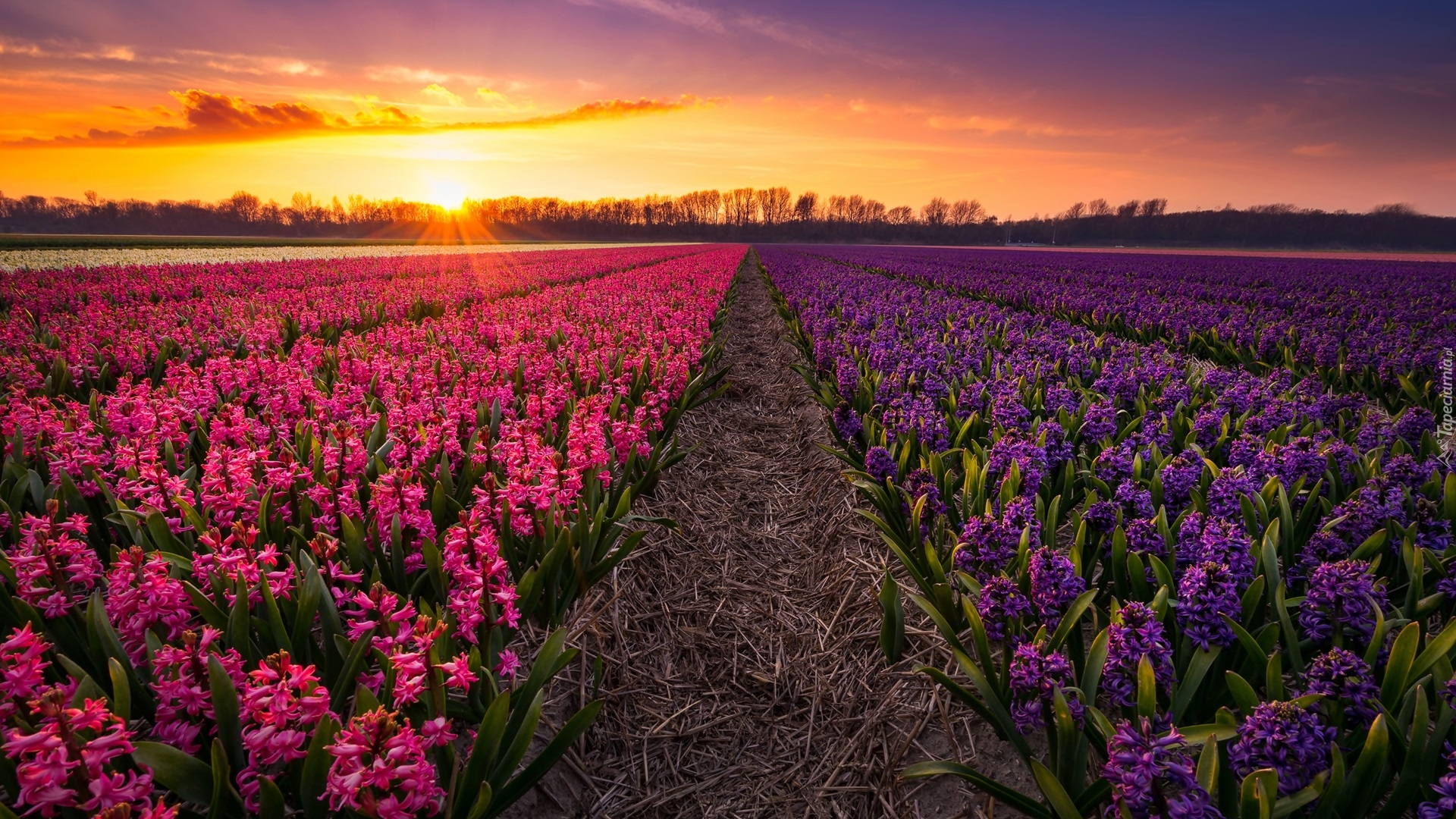 Edytor tapety: Plantacja hiacyntów o zachodzie słońca