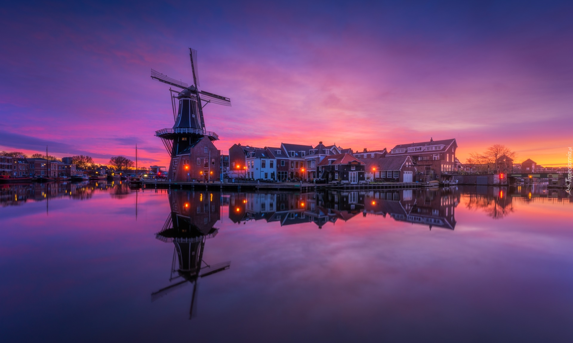 Edytor tapety: Wiatrak i domy nad holenderską rzeką Spaarne