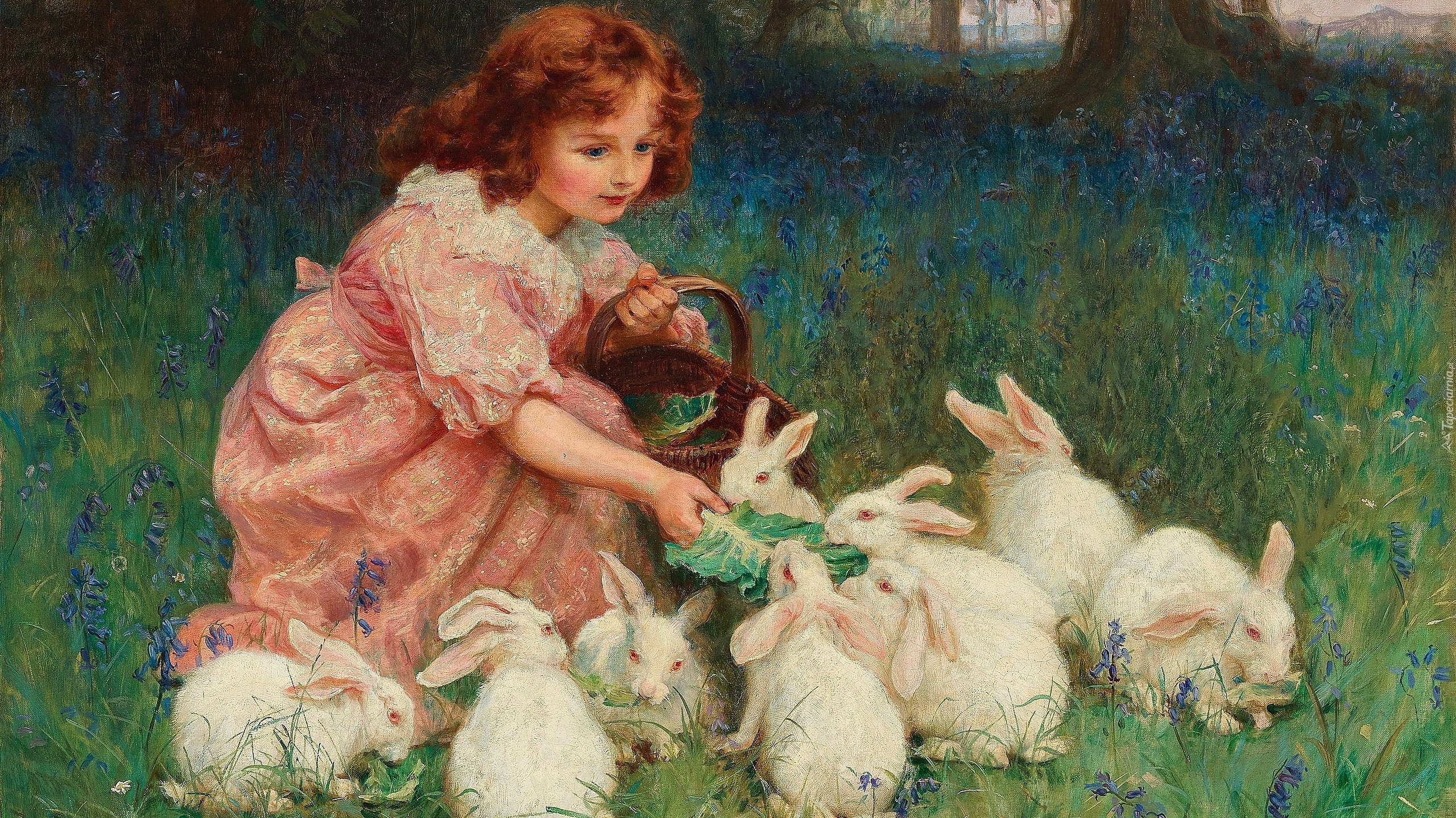 Edytor tapety: Dziewczynka karmiąca króliki na leśnej polanie