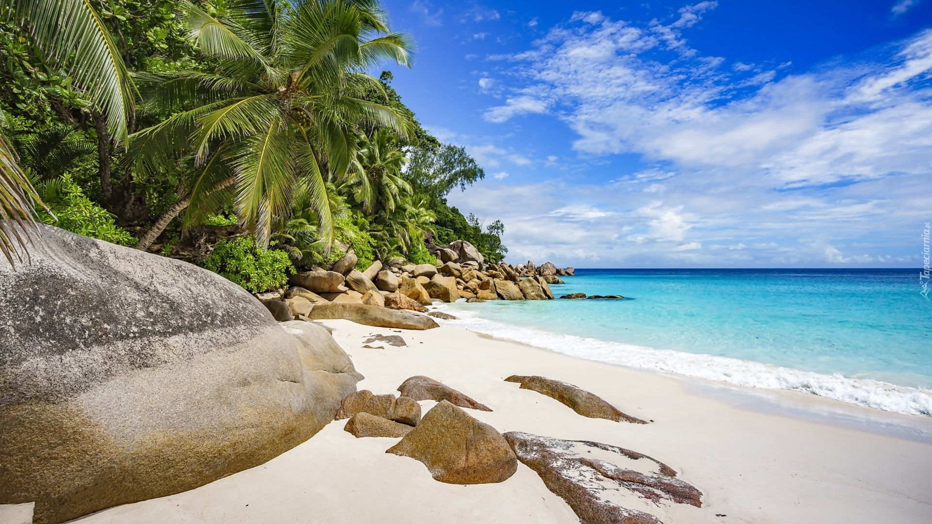 Edytor tapety: Skały i palmy na plaży Anse Georgette
