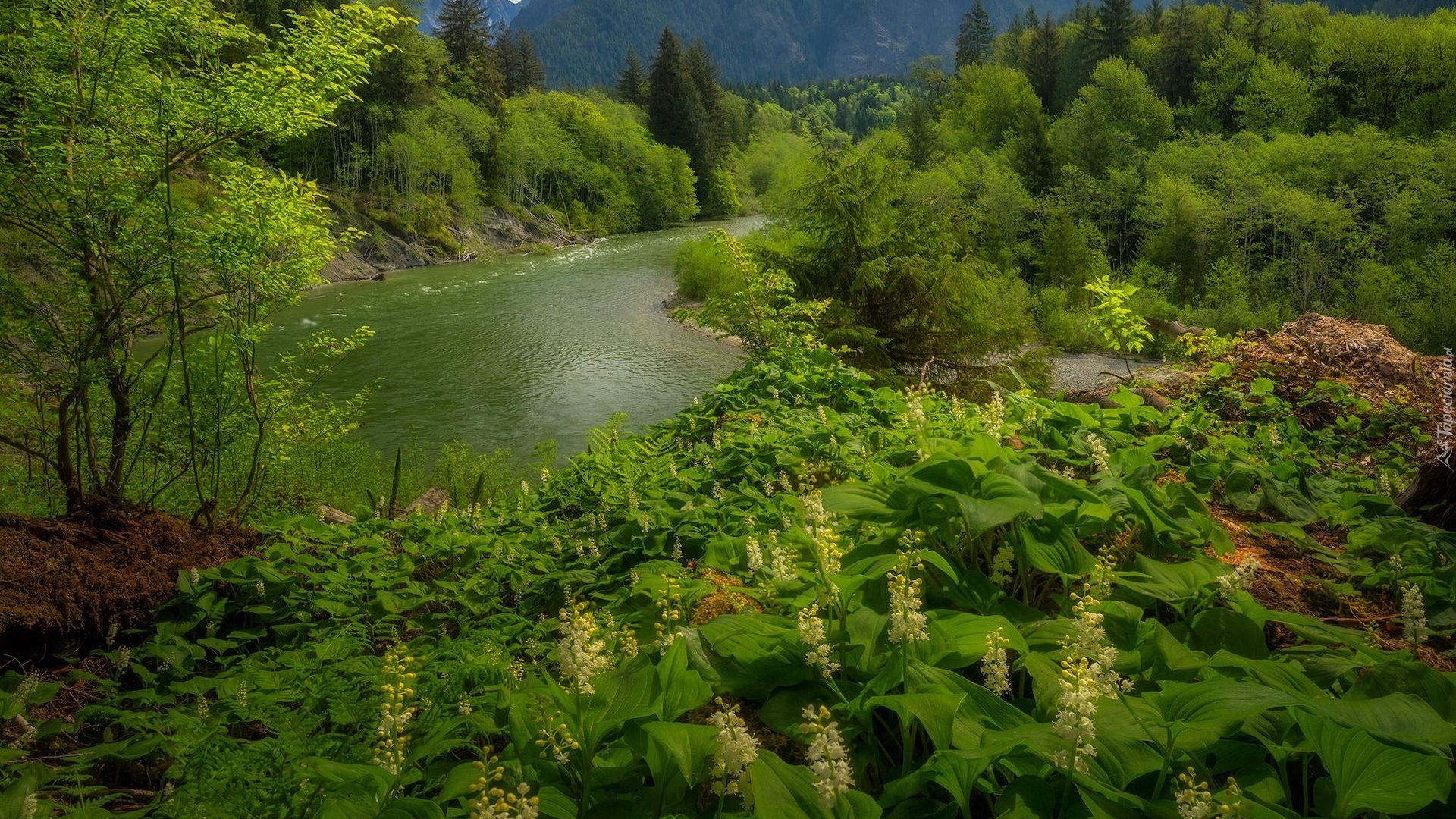 Edytor tapety: Kwiaty i drzewa nad rzeką Snoqualmie River