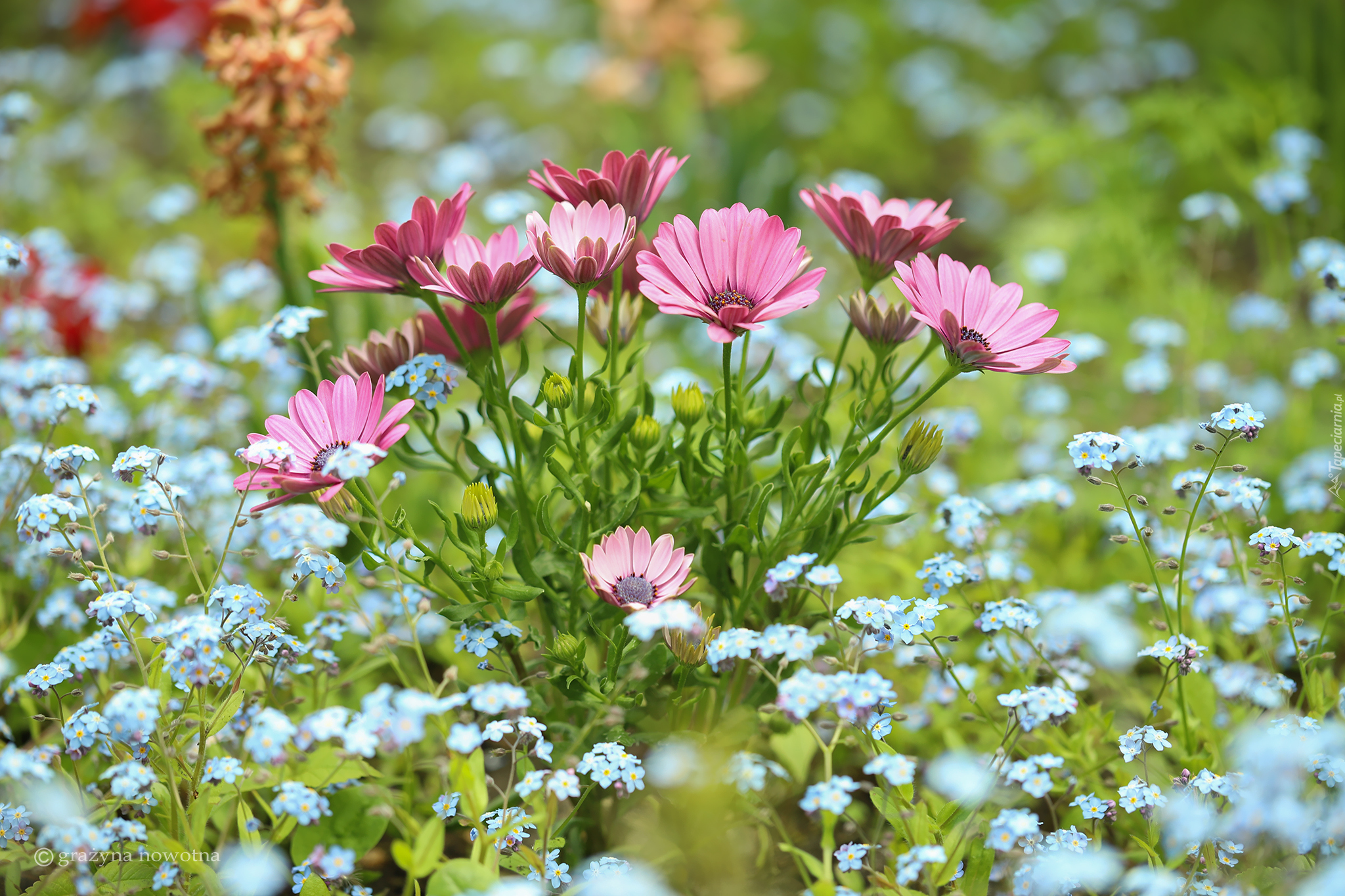 Edytor tapety: Stokrotka afrykańska wśród niezapominajek