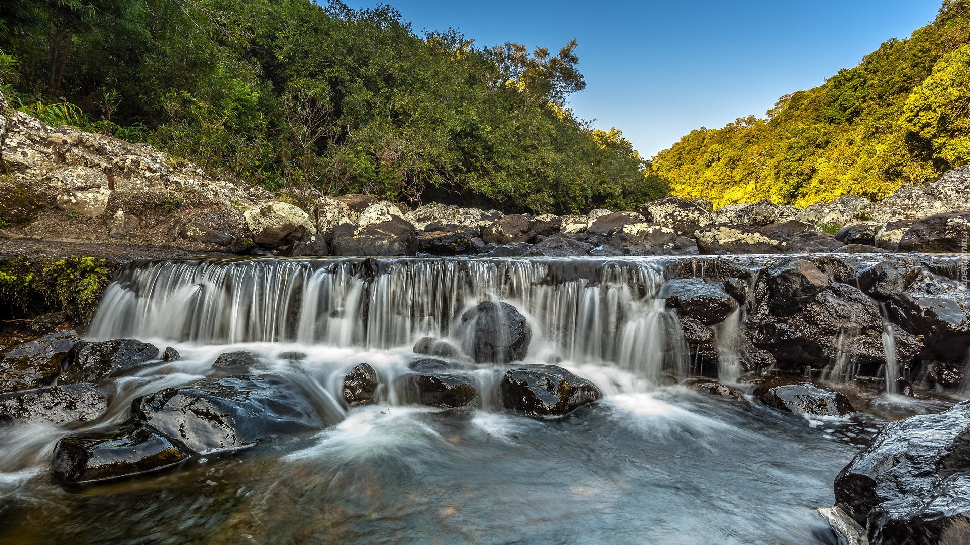 Edytor tapety: Próg rzeczny na tle drzew