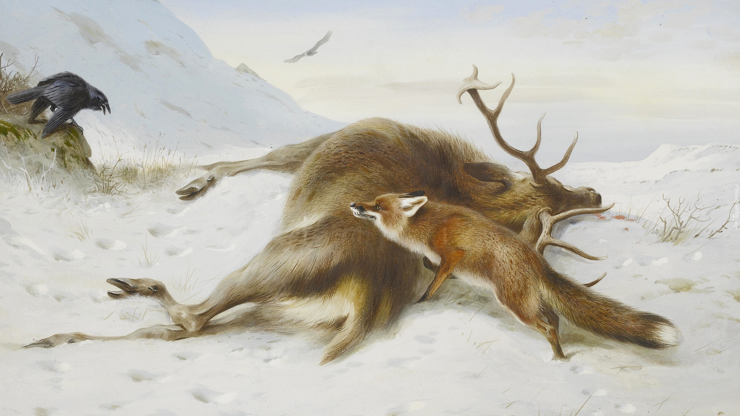 Edytor tapety: Lis obok jelenia leżącego na śniegu