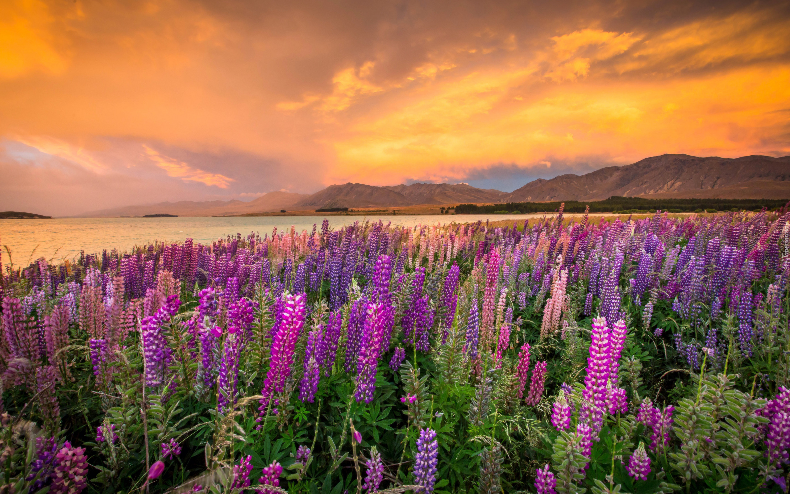 Edytor tapety: Kwitnący łubin nad jeziorem w Nowej Zelandii