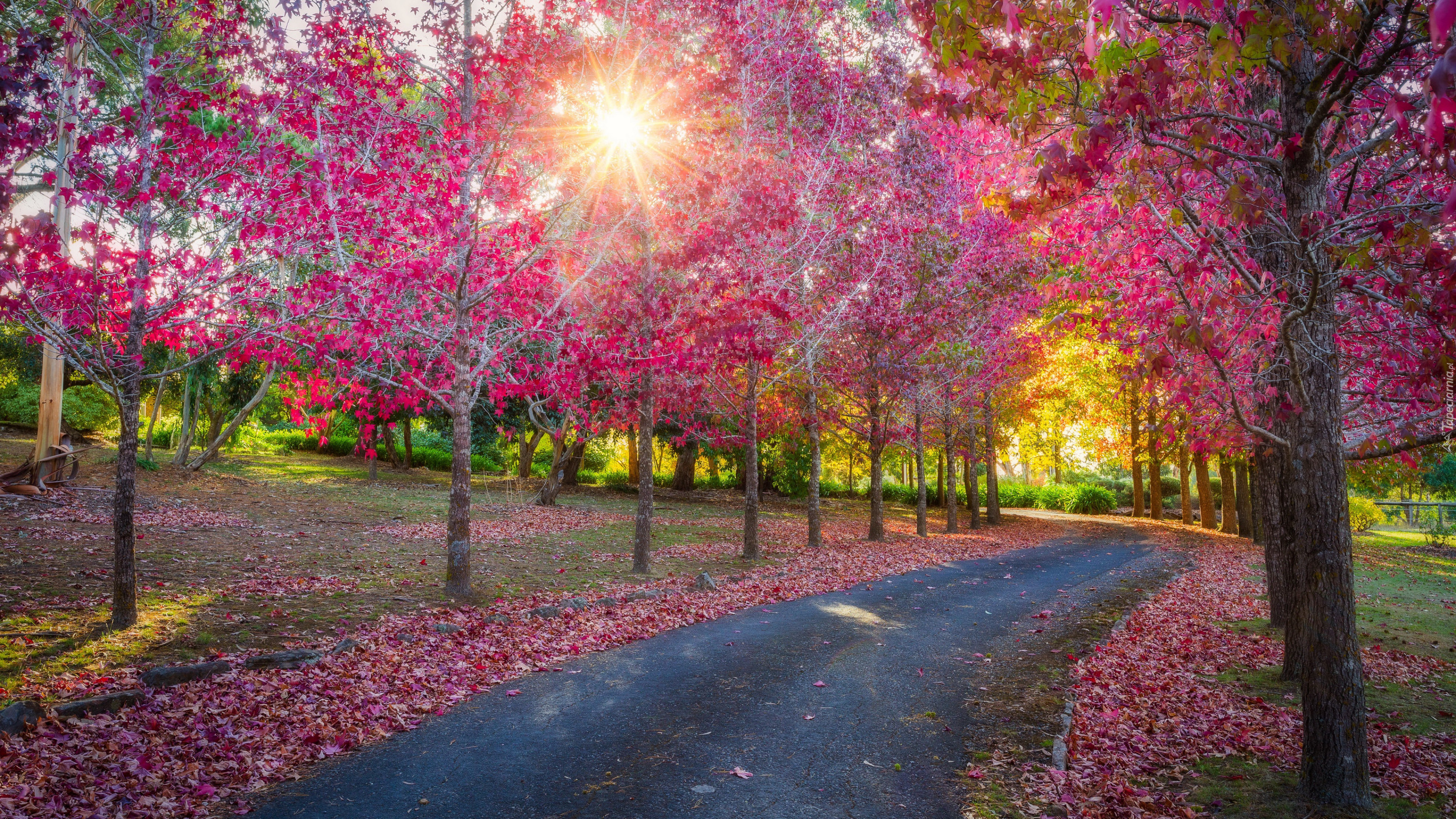 Edytor tapety: Drzewa z czerwonymi liśćmi w promieniach słońca