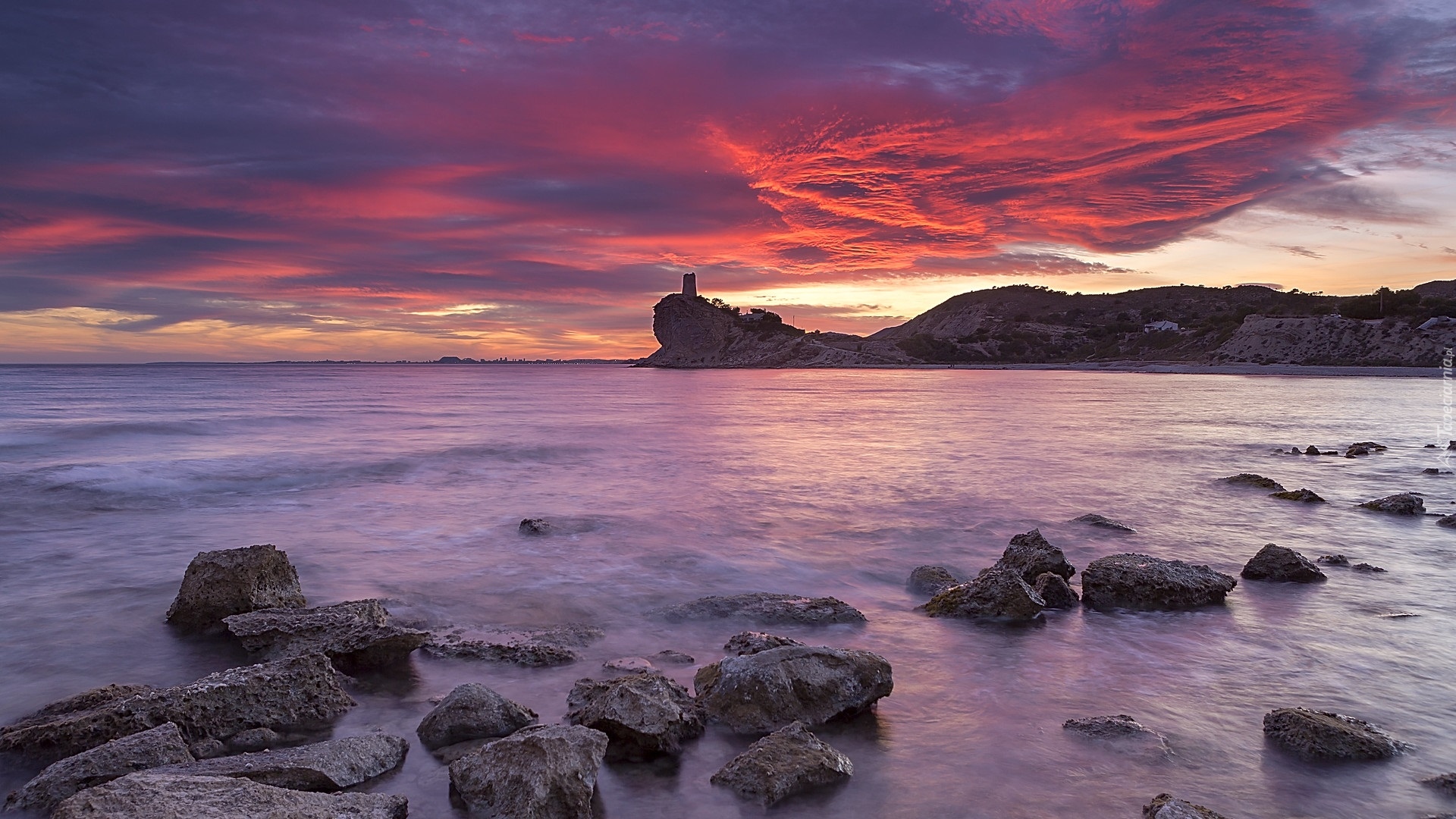 Edytor tapety: Kolorowy zachód słońca nad skalistym wybrzeżem