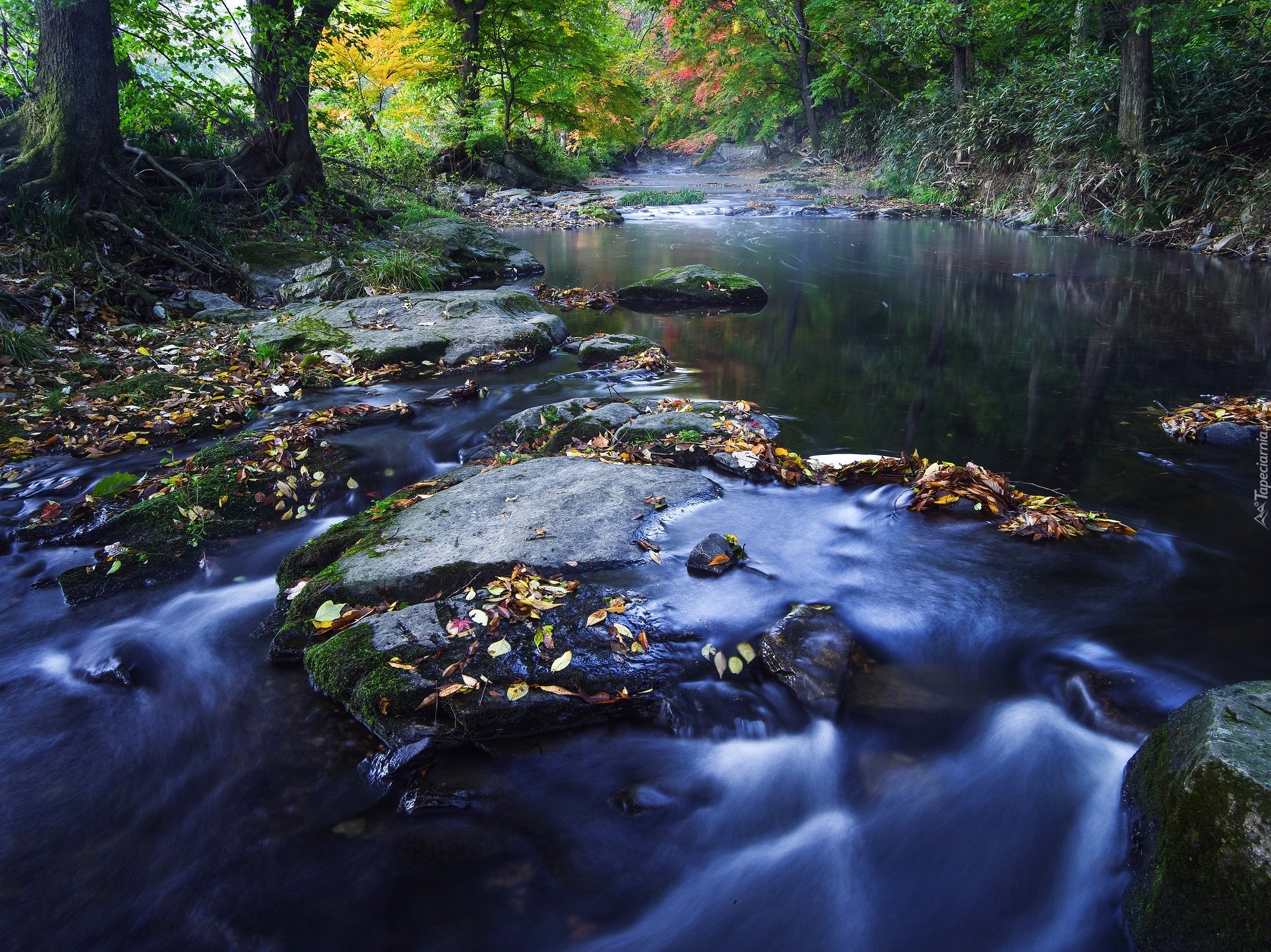 Edytor tapety: Opadłe liście na kamieniach w leśnym potoku