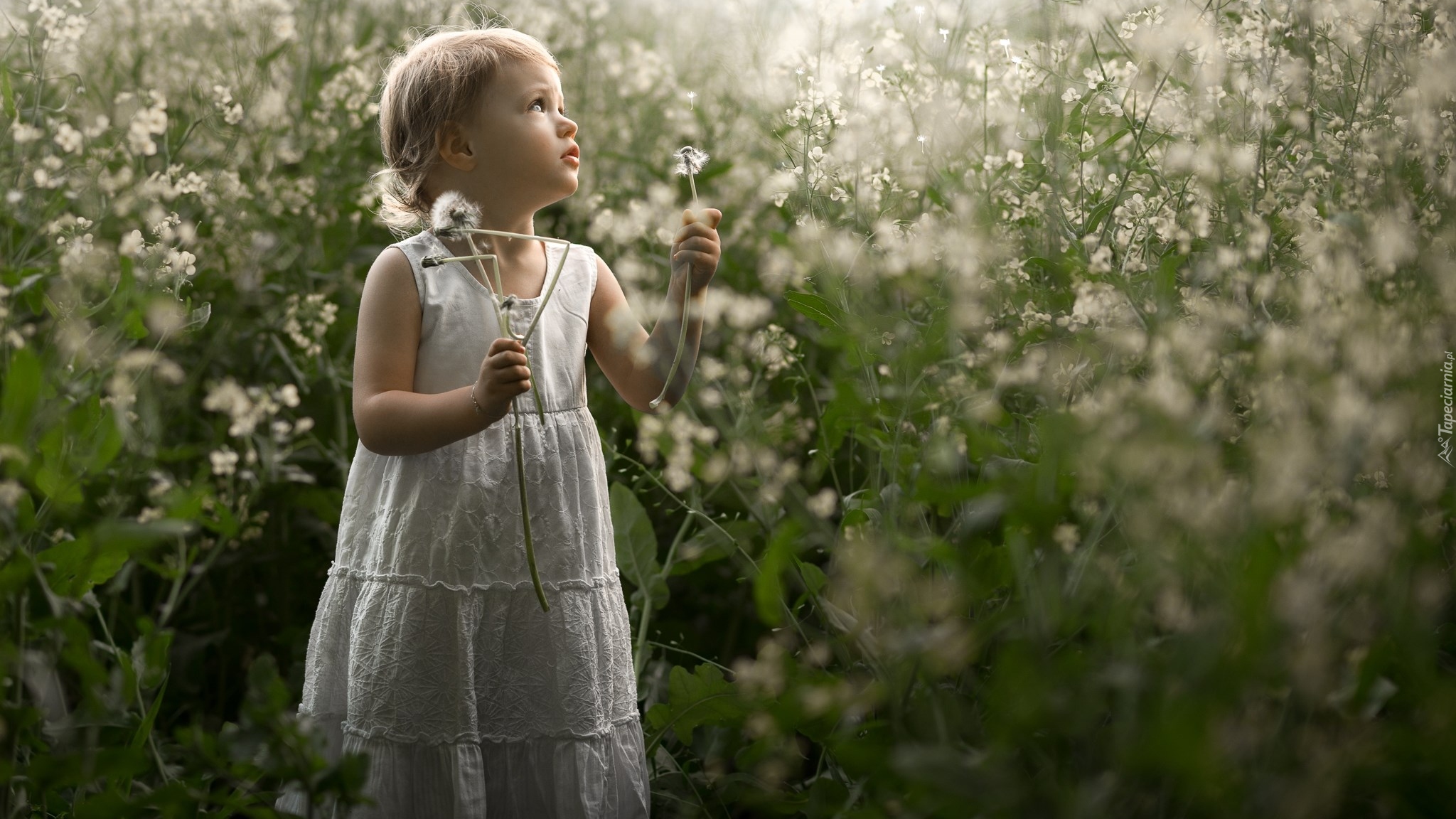 Edytor tapety: Dziewczynka na łące z dmuchawcami w rękach
