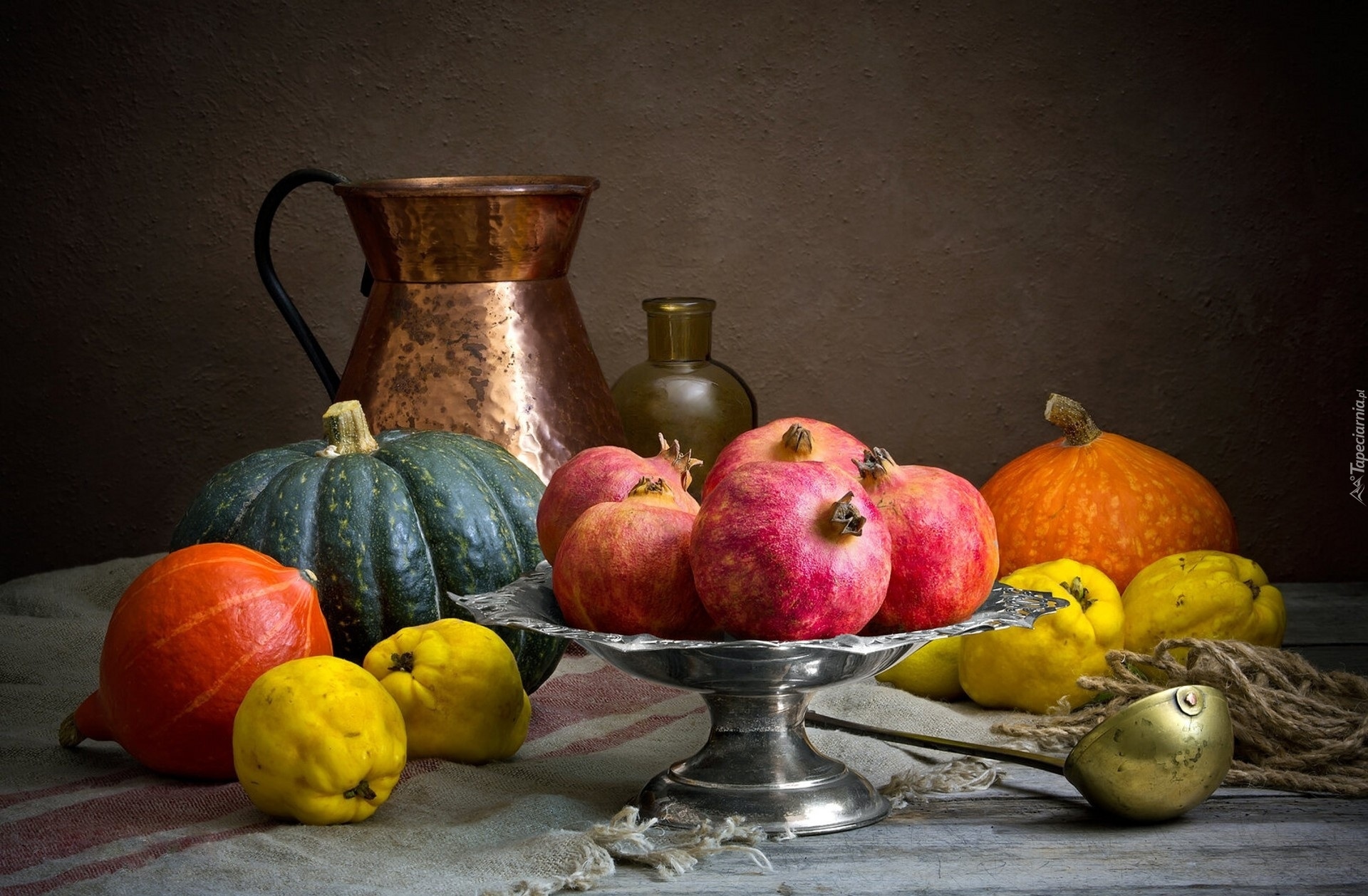Edytor tapety: Patera z granatami obok dyń i dzbanka