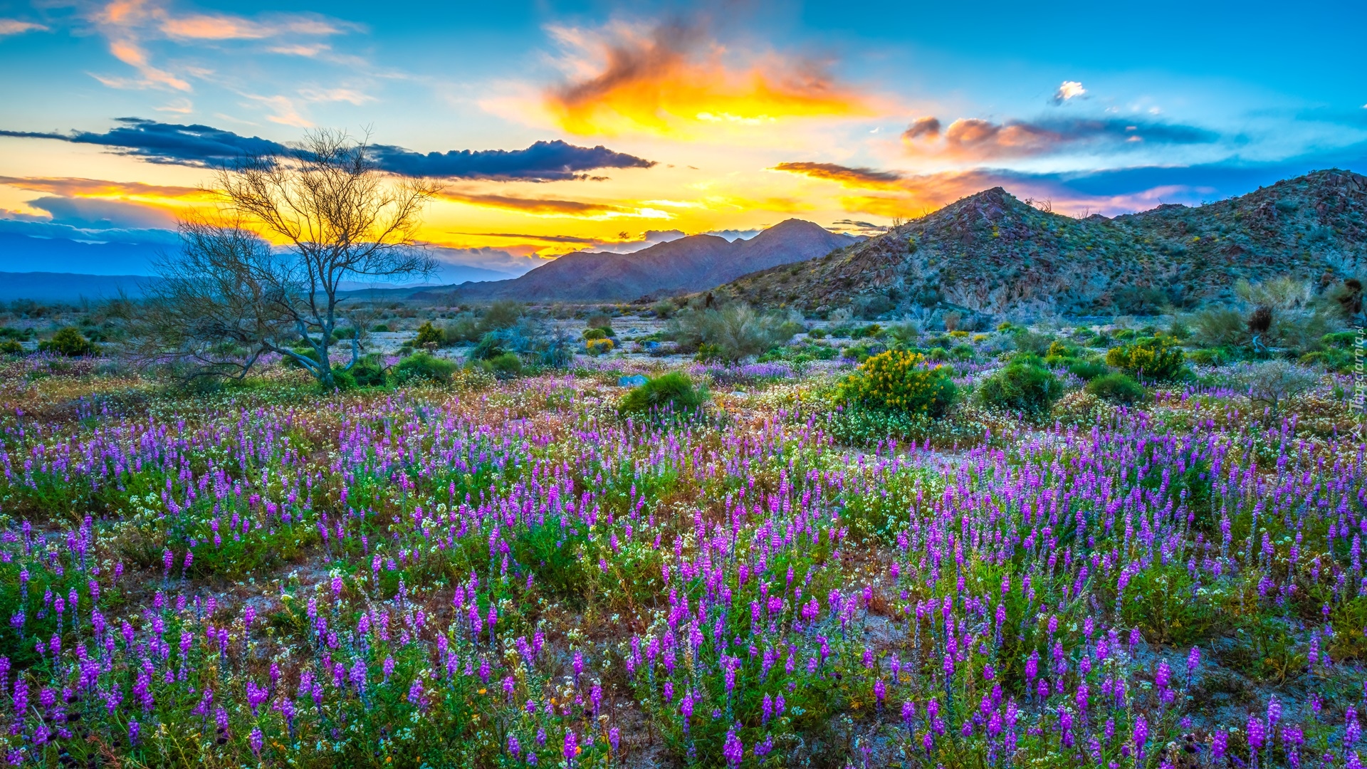 Edytor tapety: Kwiatowa łąka na tle wschodzącego nad wzgórzami słońca