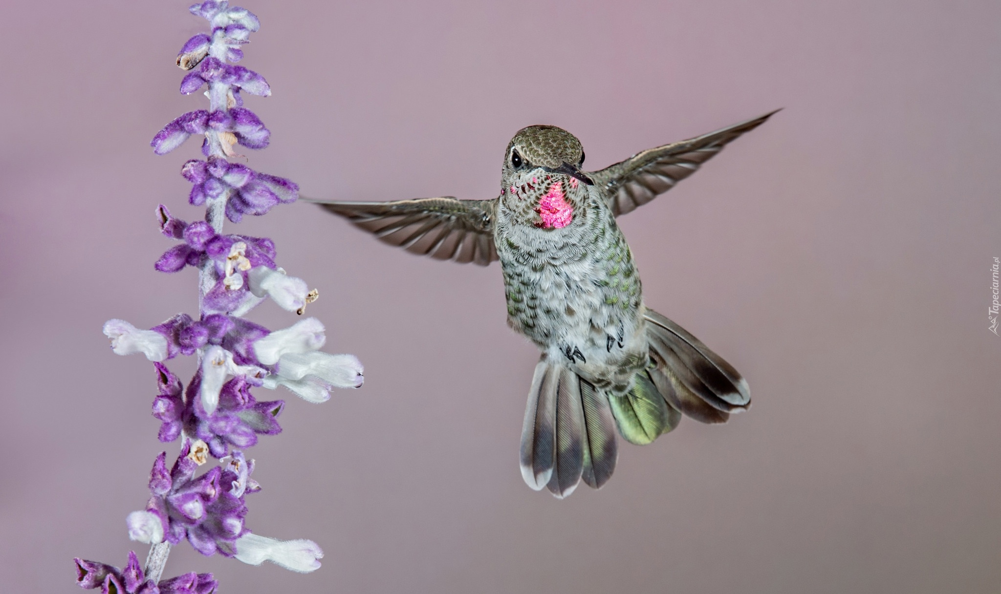 Edytor tapety: Koliber obok fioletowo-białego kwiatka