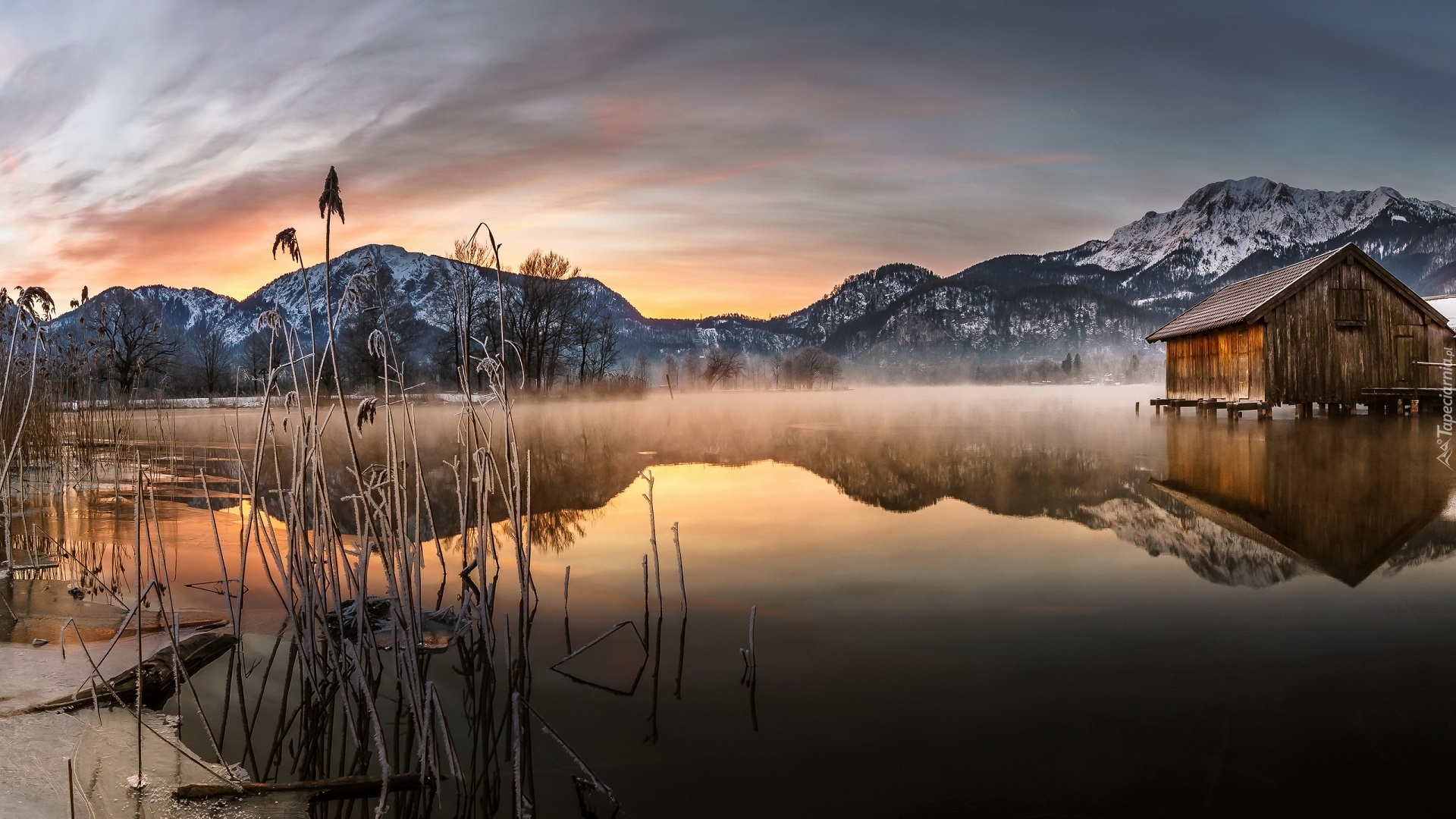Edytor tapety: Drewniany domek na jeziorze u stóp ośnieżonych gór
