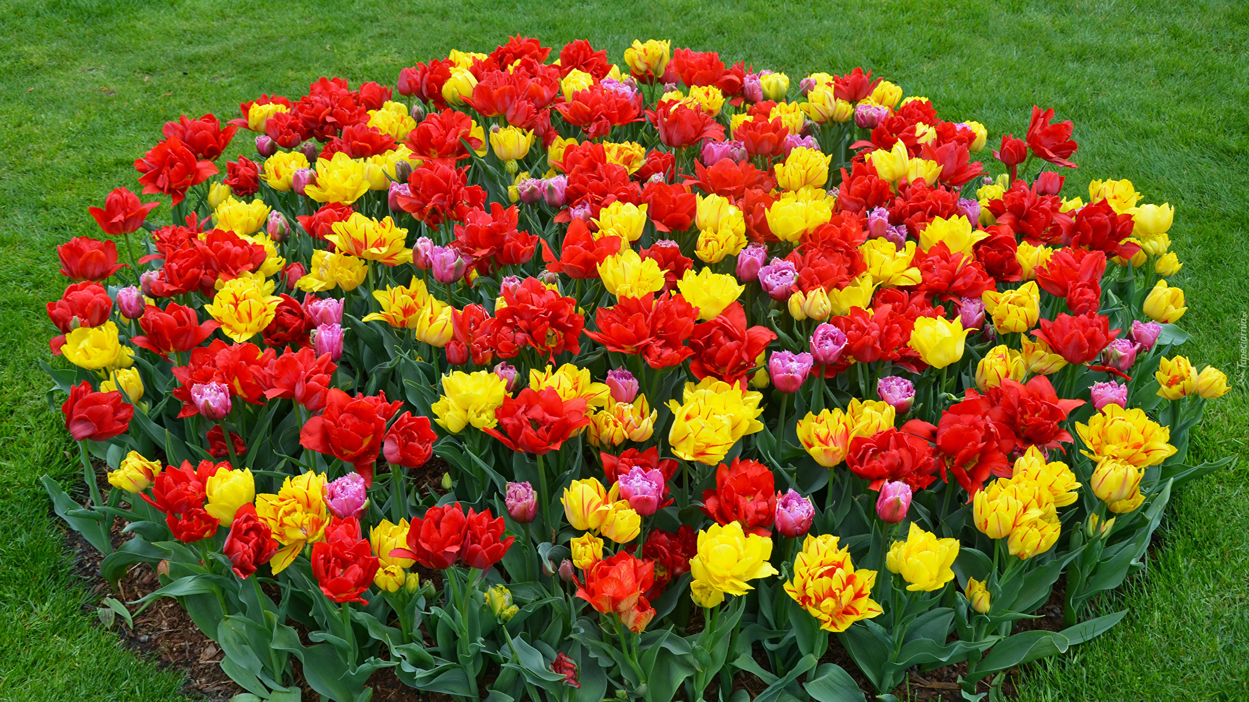 Edytor tapety: Kolorowe tulipany na rabatce