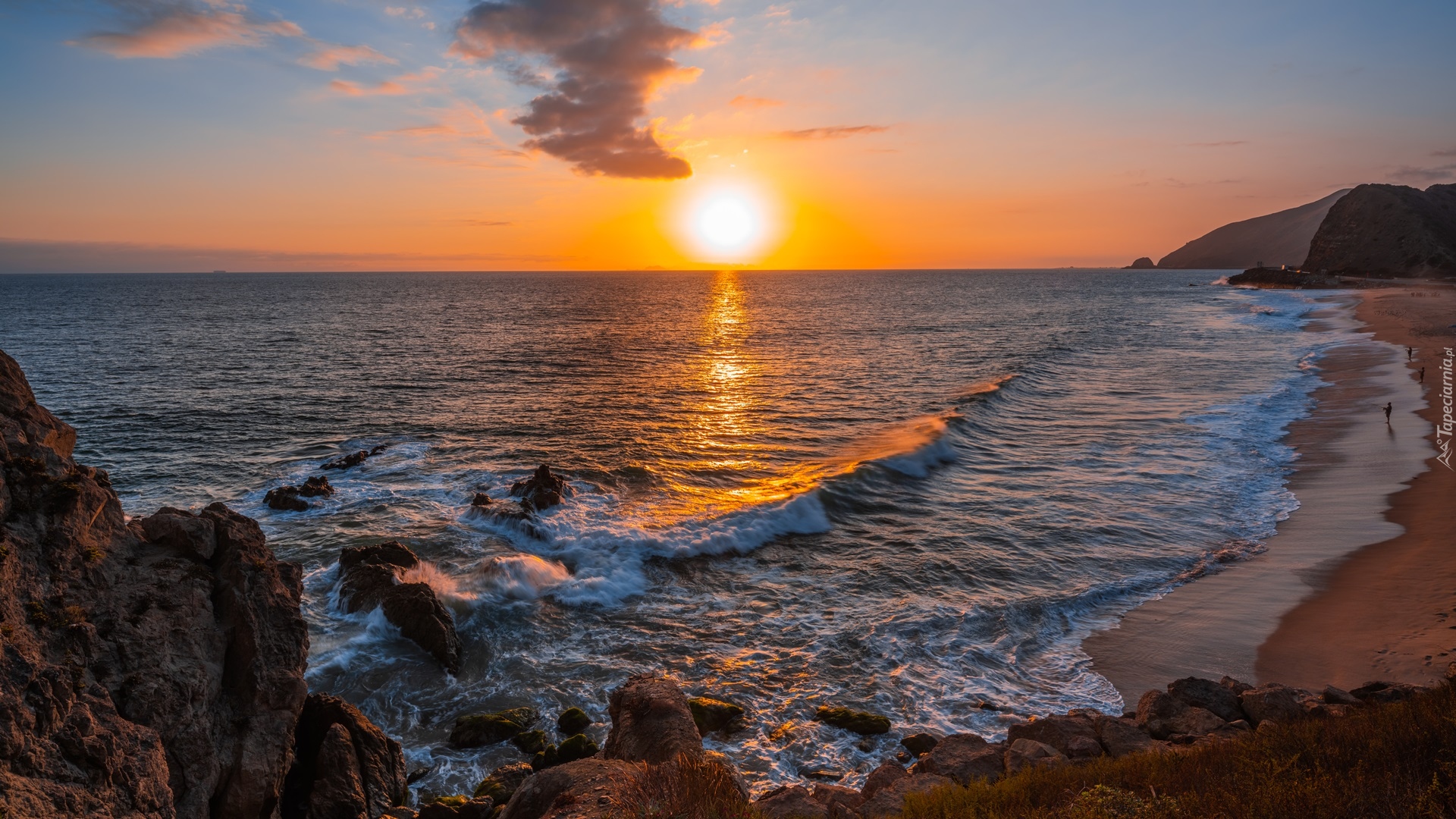 Edytor tapety: Fale na morskim brzegu w blasku zachodzącego słońca