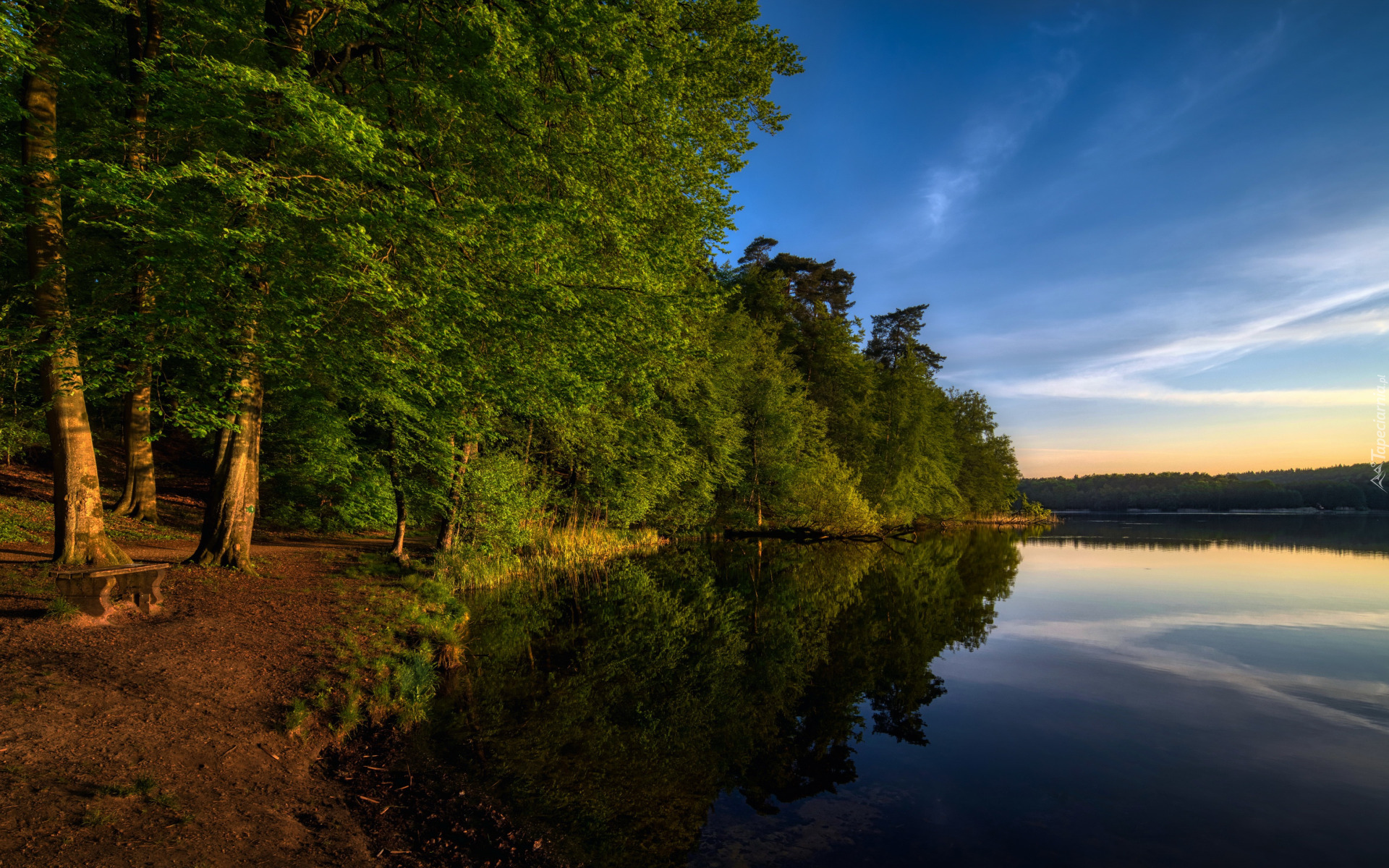 Edytor tapety: Ławka pod drzewem nad jeziorem