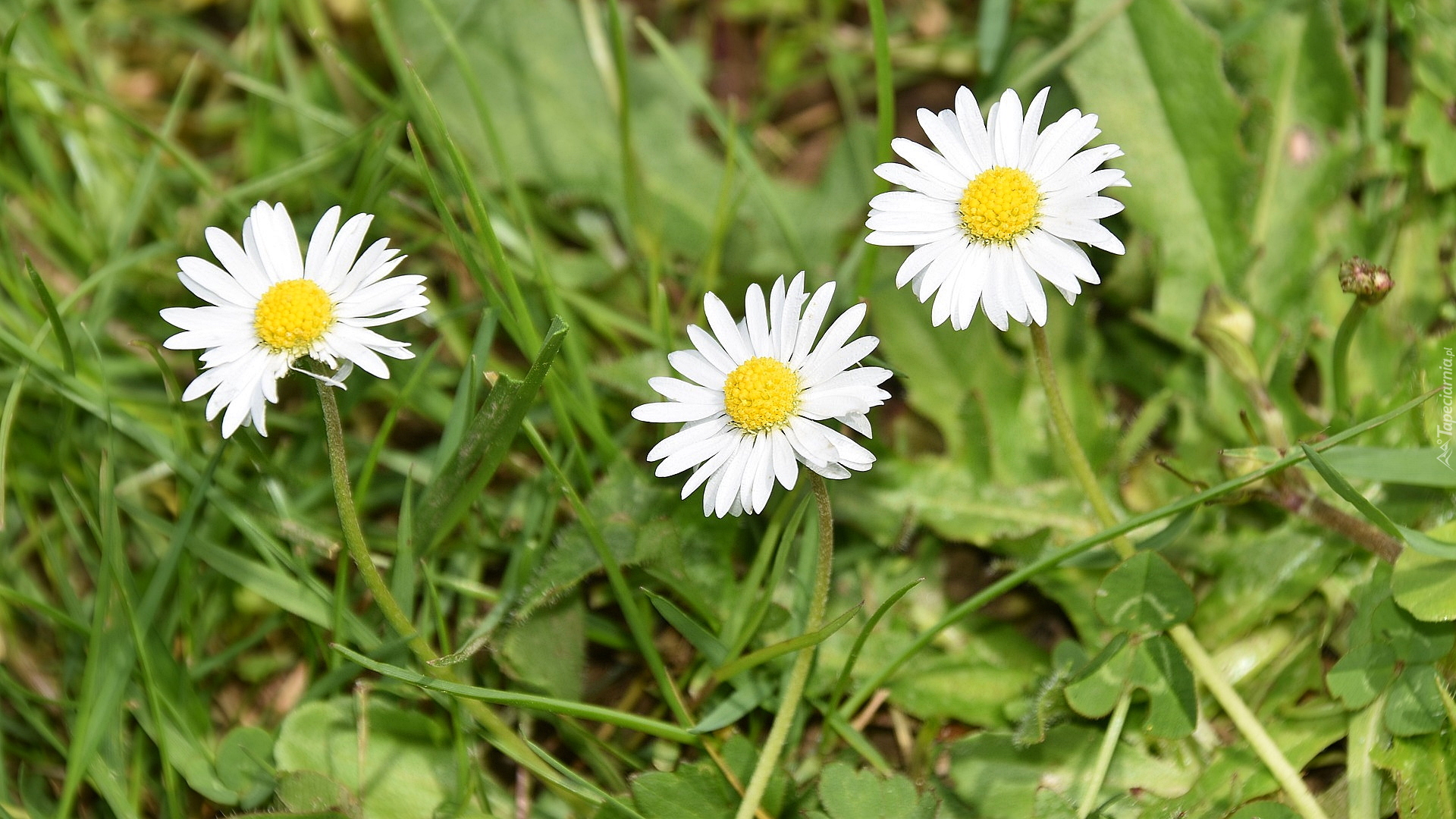Edytor tapety: Trzy stokrotki w trawie