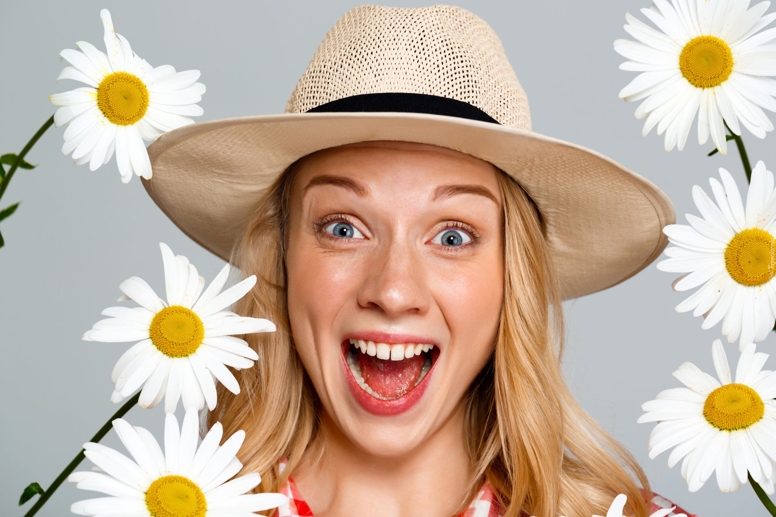 Edytor tapety: Uśmiechnięta dziewczyna w kapeluszu pośród margerytek