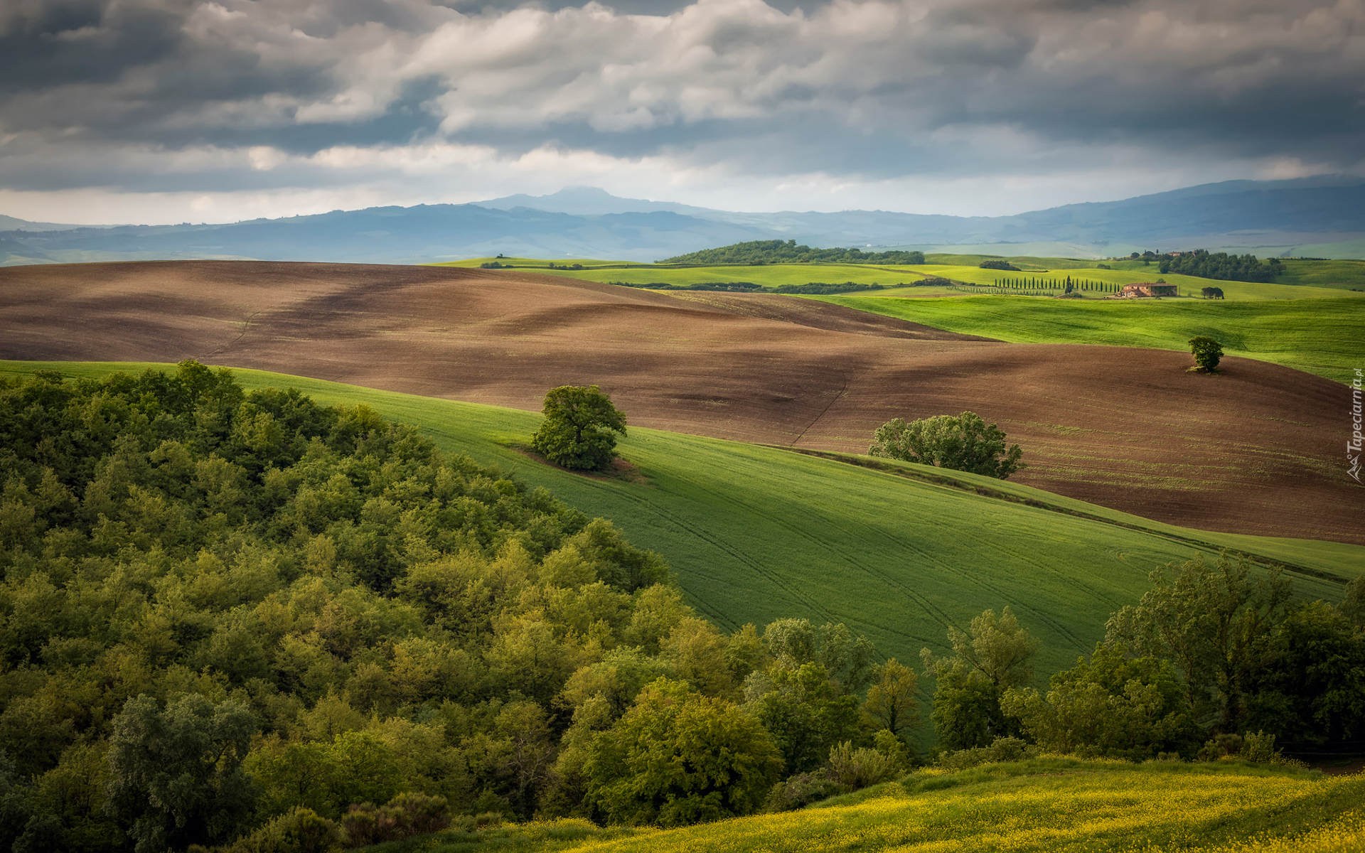 Edytor tapety: Drzewa i pola na wzgórzach Toskanii