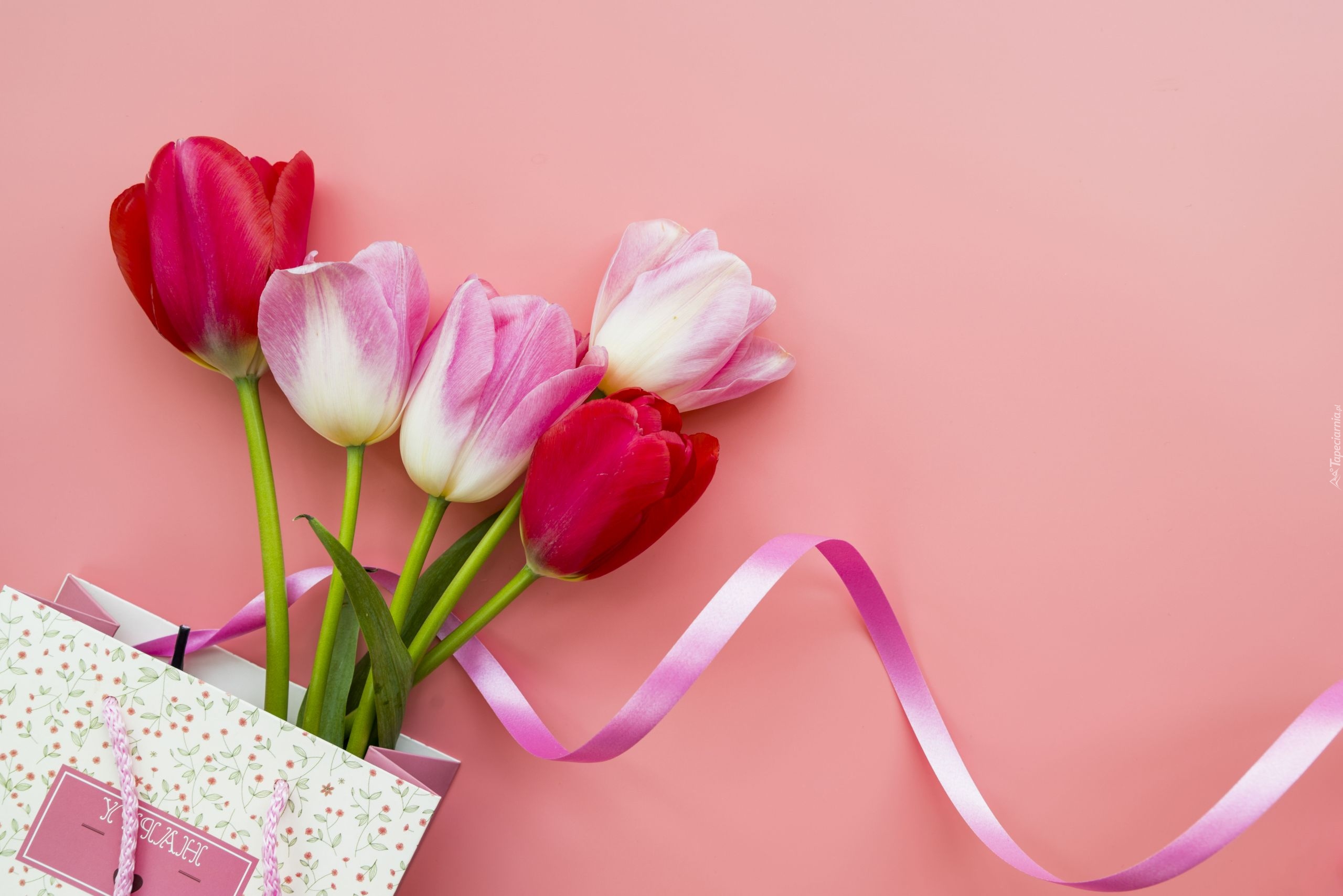 Edytor tapety: Tulipany w ozdobnej torebce ze wstążką