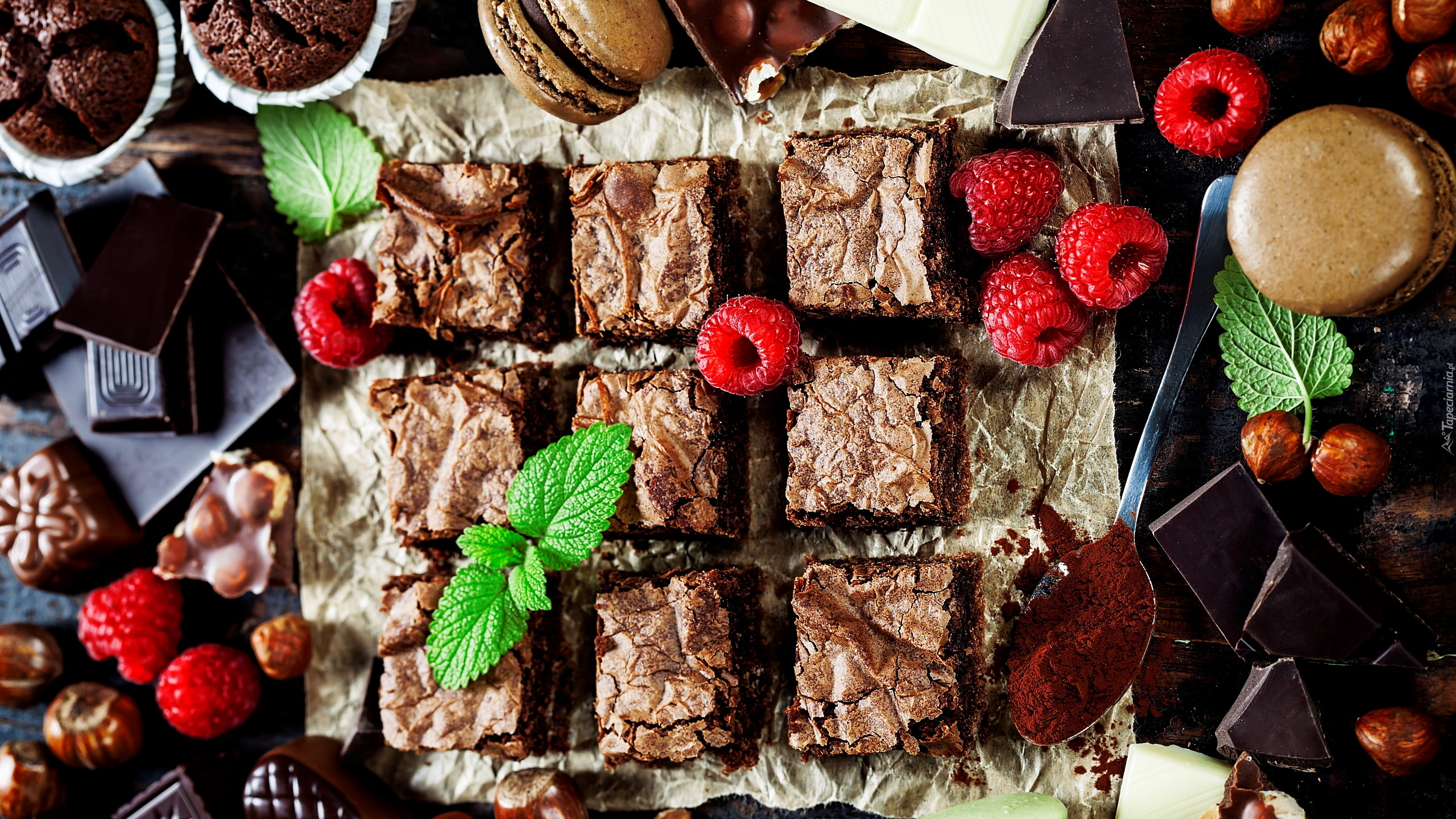 Edytor tapety: Kawałki ciasta pośród malin i kostek czekolady