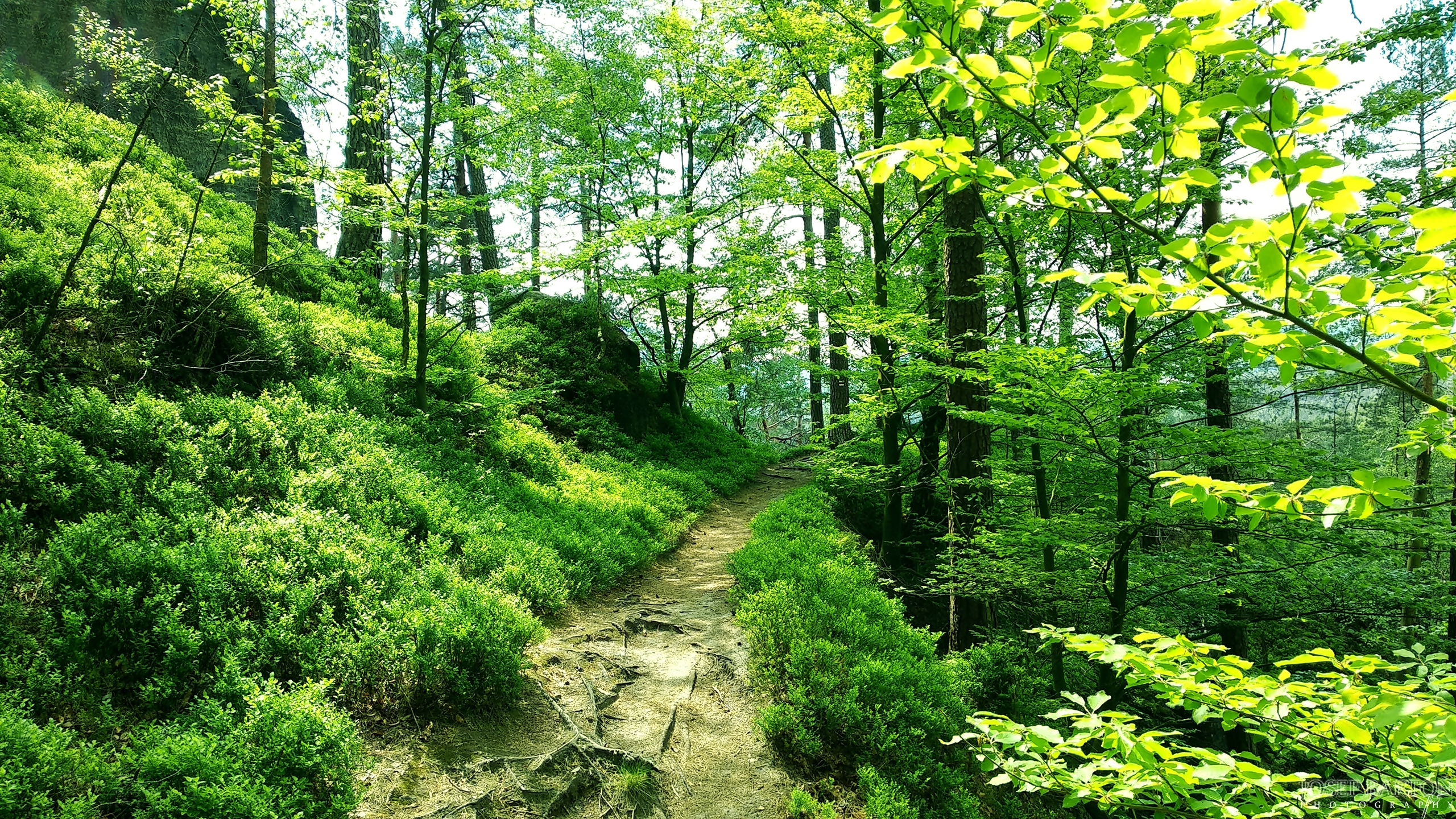 Edytor tapety: Wiosenne drzewa przy ściezce w słonecznym lesie